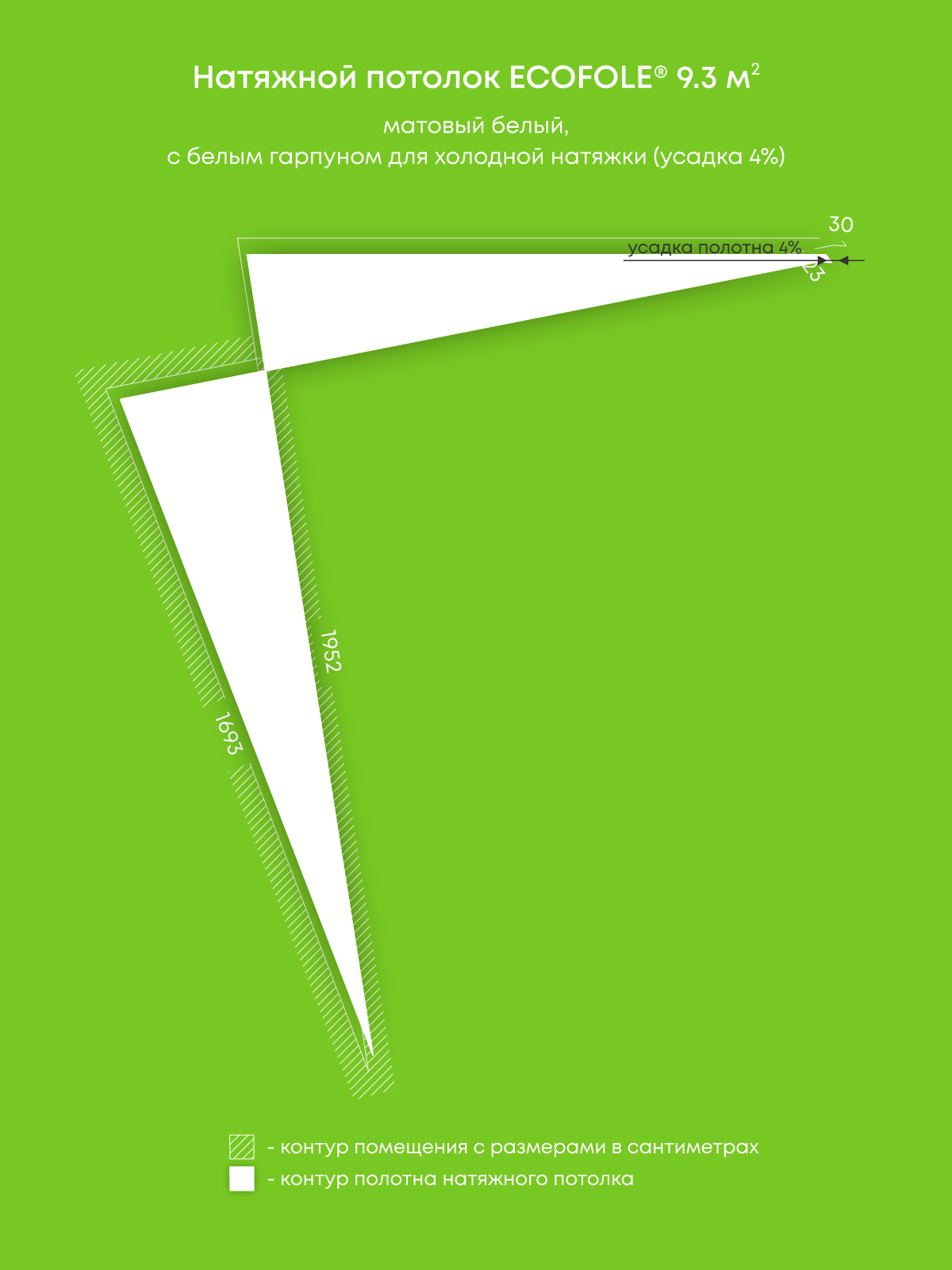 Натяжной потолок белый матовый, изготовленный по индивидуальным размерам покупателя, для комнаты площадью 9.3 м2
