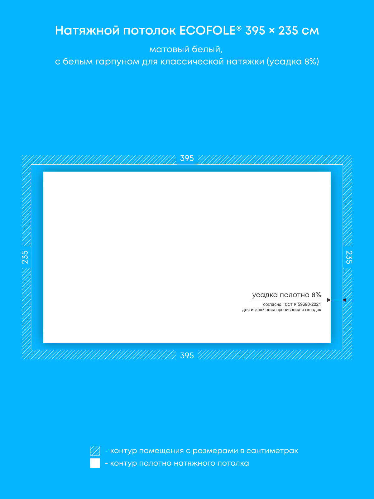Натяжной потолок белый матовый, классической натяжки, изготовленный по индивидуальным размерам покупателя, для помещения площадью 9.3 м2