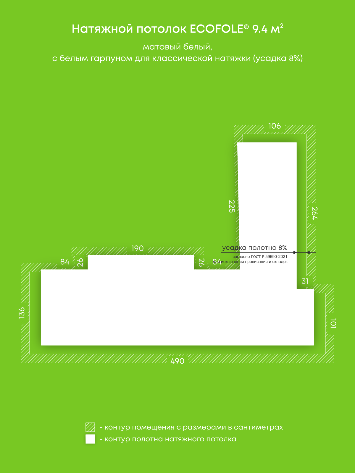 Натяжной потолок белый матовый, изготовленный по индивидуальным размерам покупателя, для комнаты площадью 9.4 м2