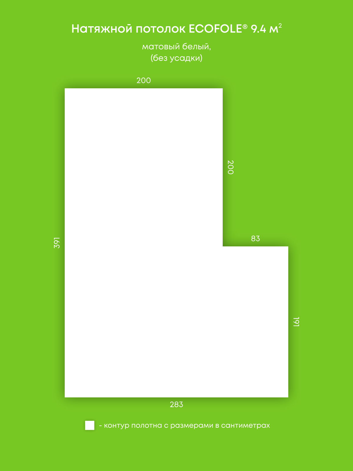 Натяжной потолок белый матовый, изготовленный по индивидуальным размерам покупателя, для помещения площадью 9.4 м2