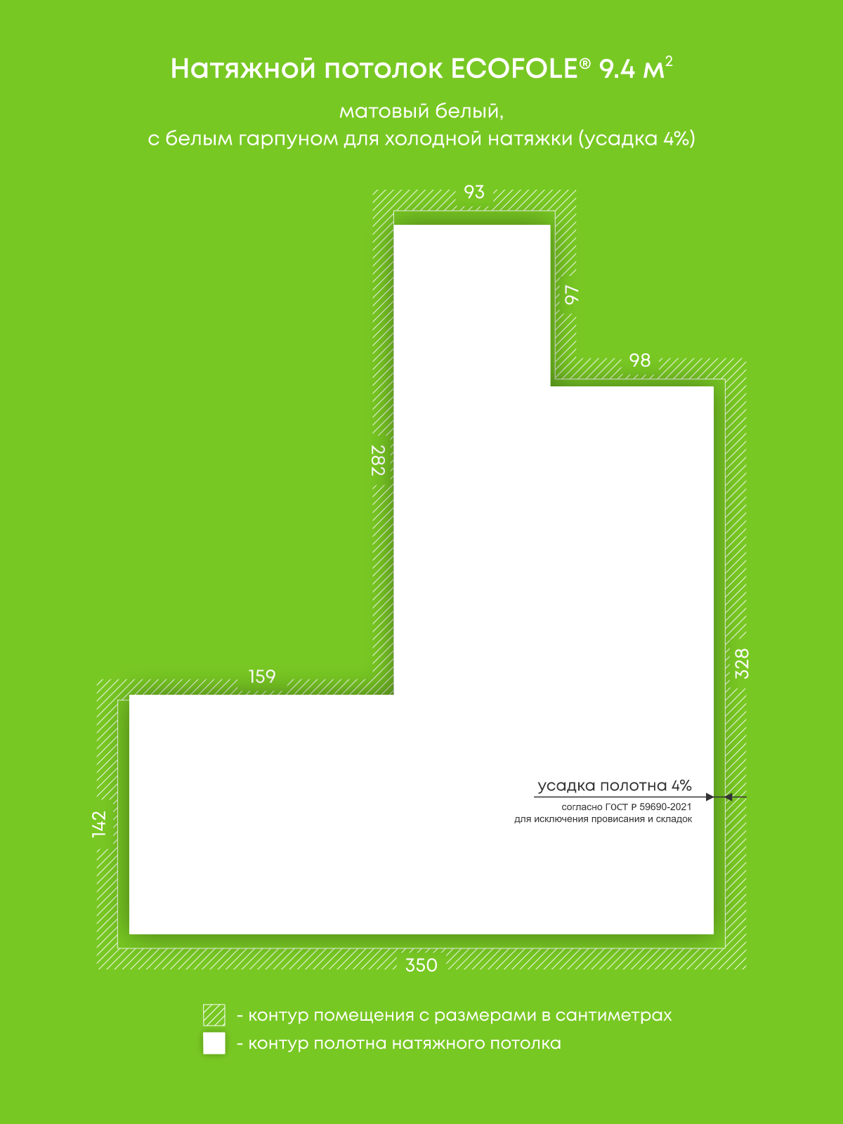 Натяжной потолок белый матовый, изготовленный по индивидуальным размерам покупателя, для гостиной площадью 9.4 м2