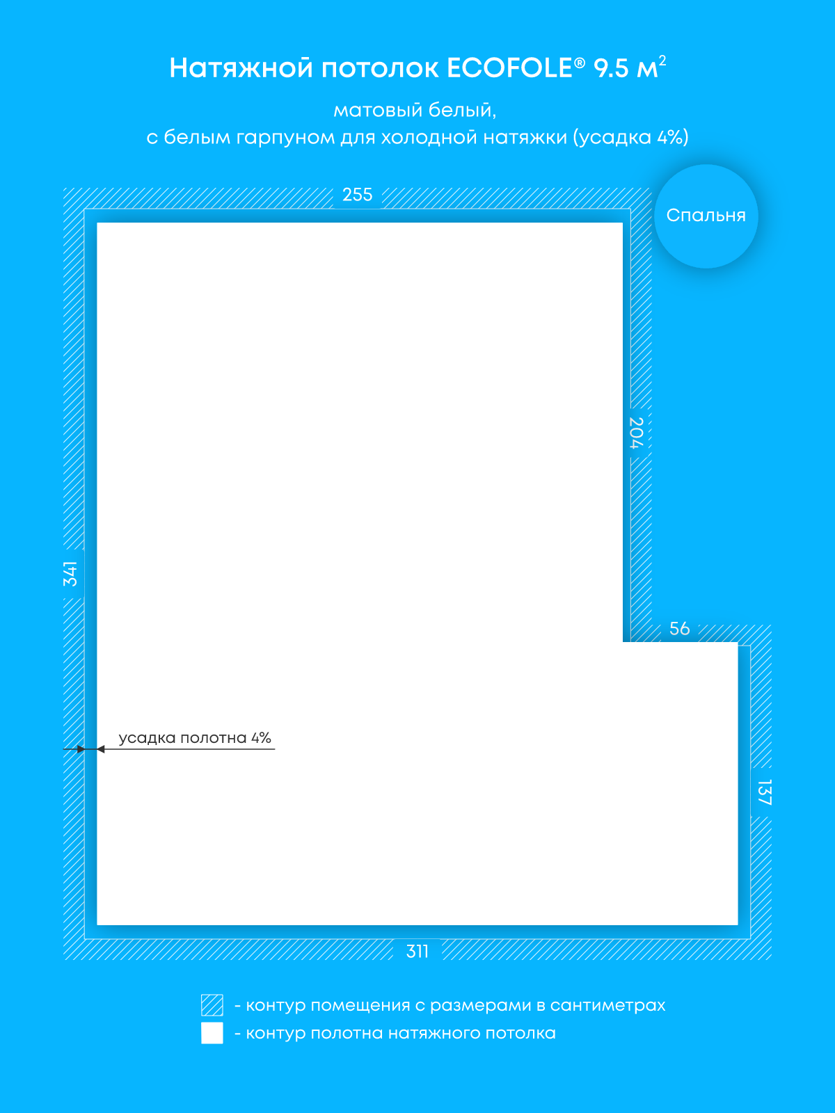 Натяжной потолок белый матовый, изготовленный по индивидуальным размерам покупателя, для спальни площадью 9.5 м2