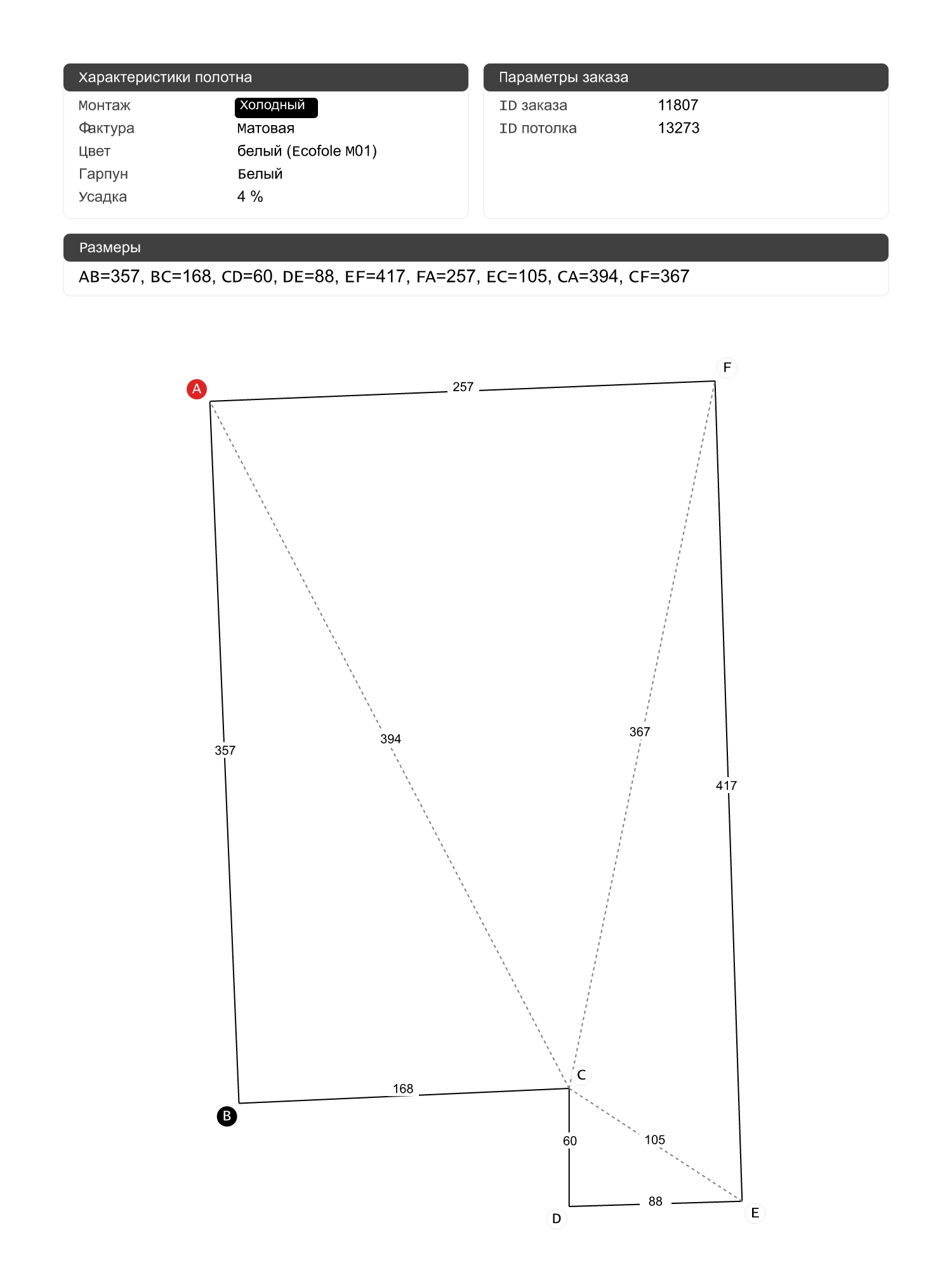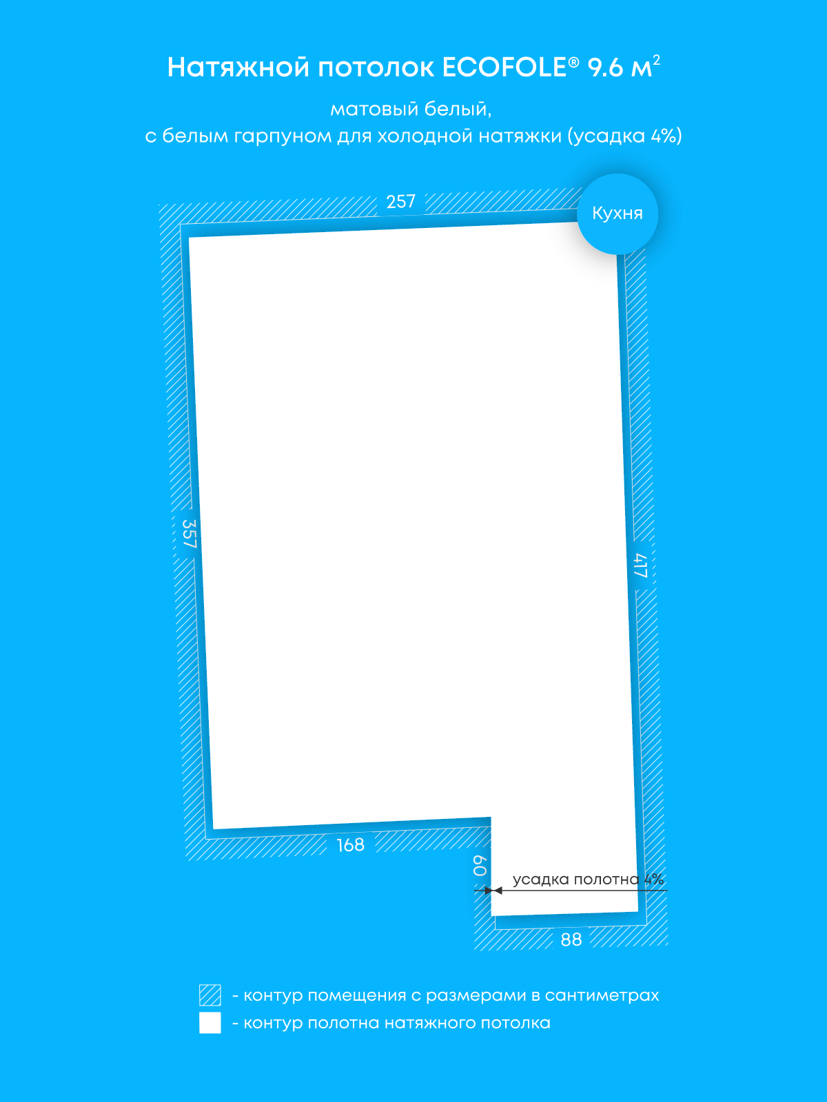 Натяжной потолок белый матовый, холодной натяжки, изготовленный по индивидуальным размерам покупателя, для помещения площадью 9.6 м2