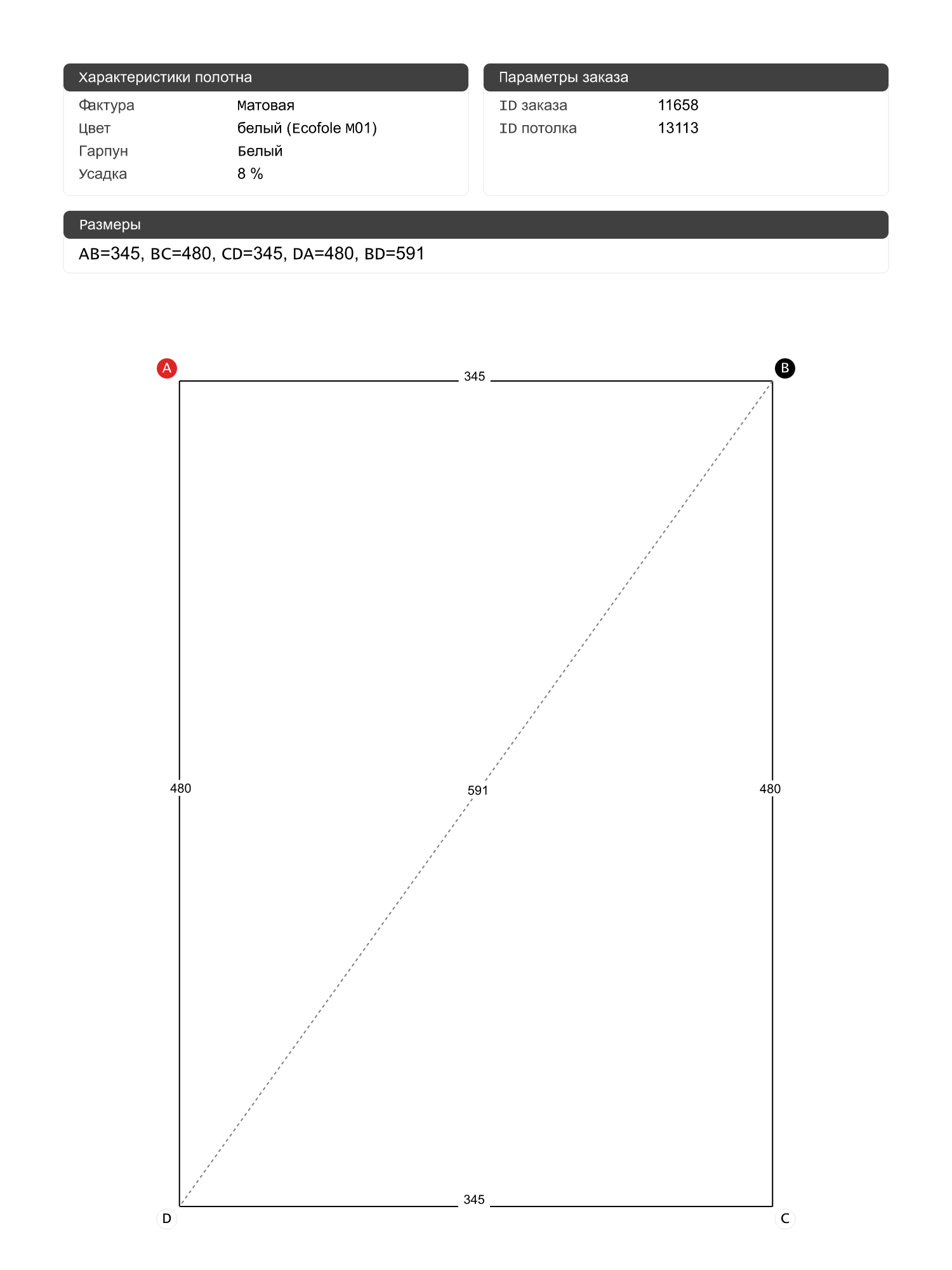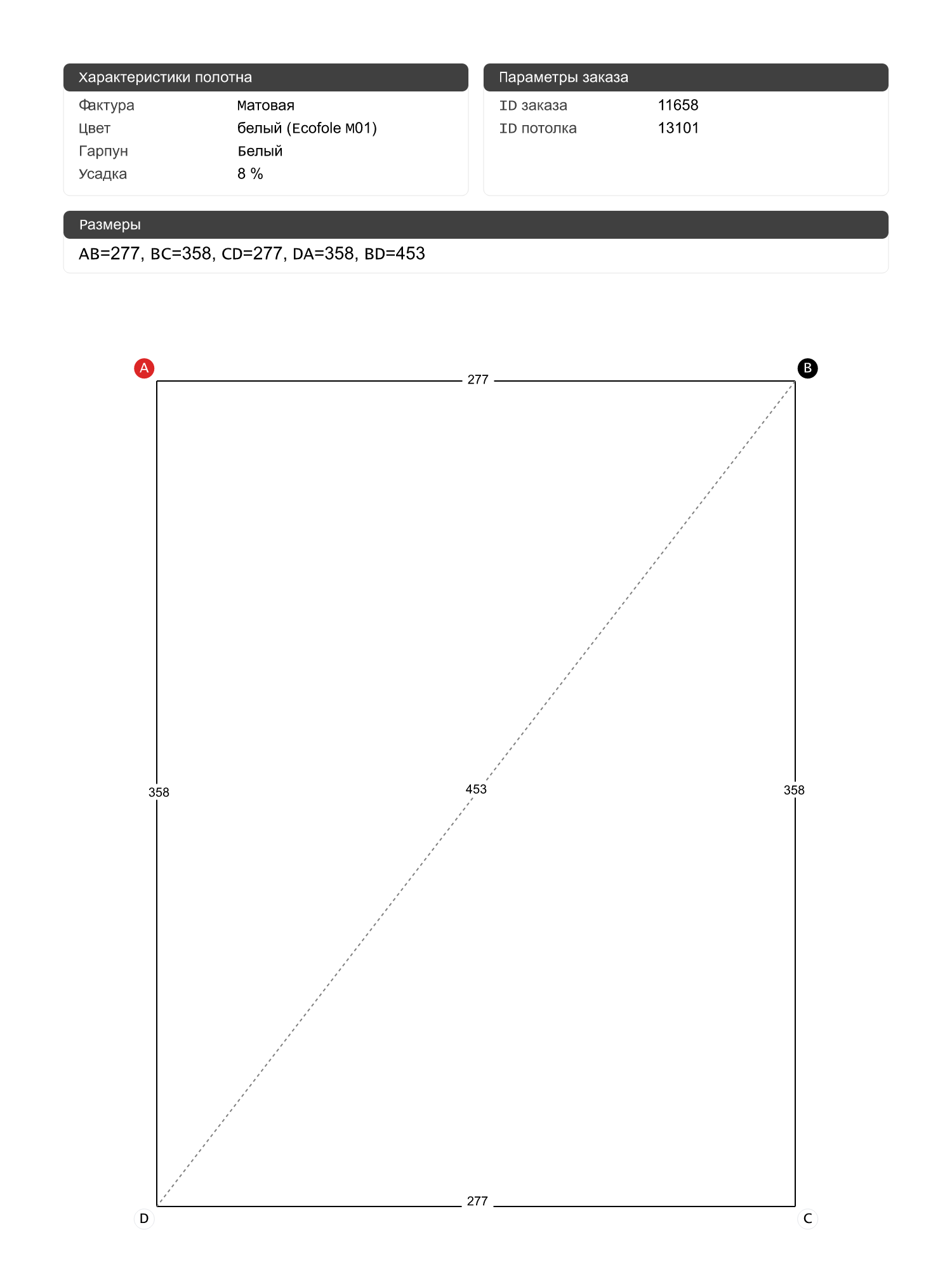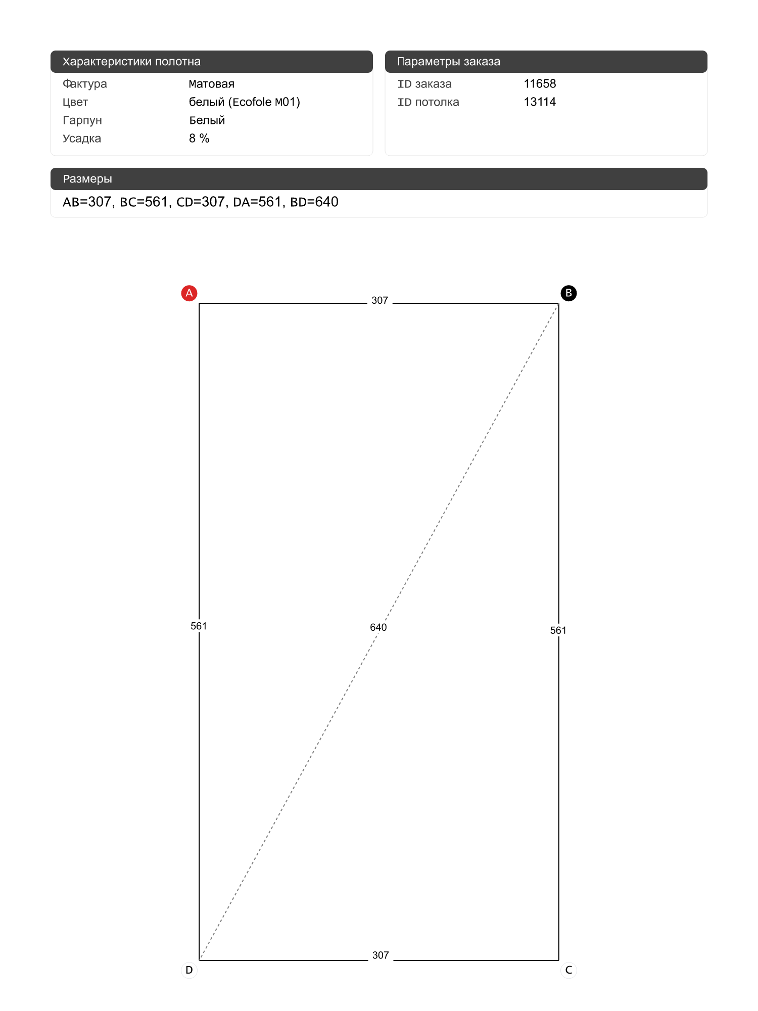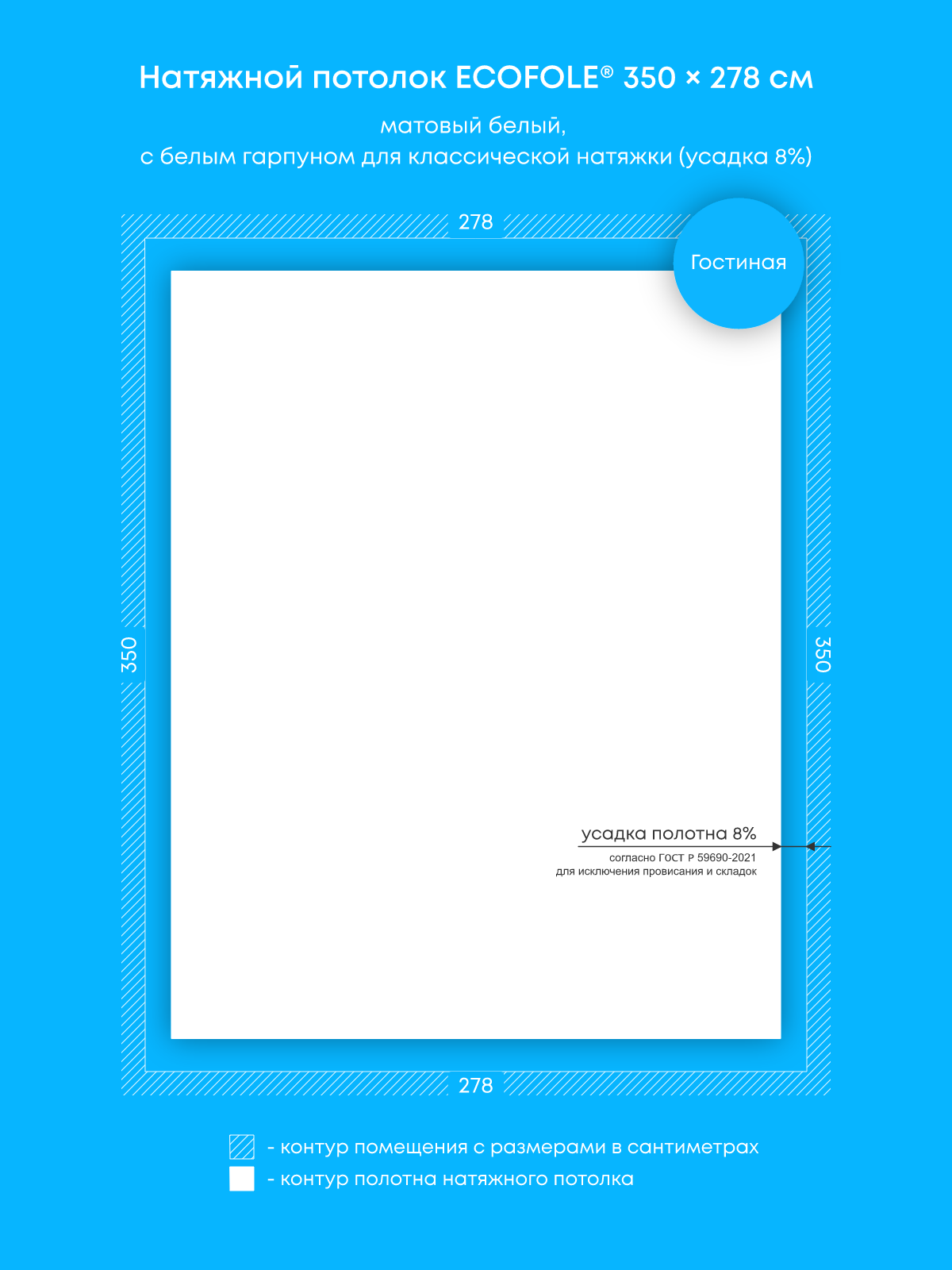 Натяжной потолок белый матовый, классической натяжки, изготовленный по индивидуальным размерам покупателя, для помещения площадью 9.7 м2