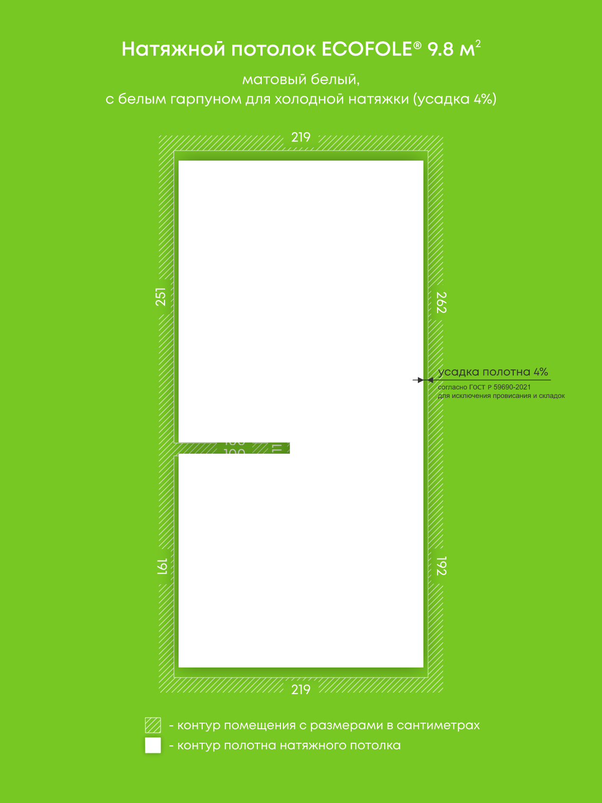 Натяжной потолок белый матовый, изготовленный по индивидуальным размерам покупателя, для спальни площадью 9.8 м2