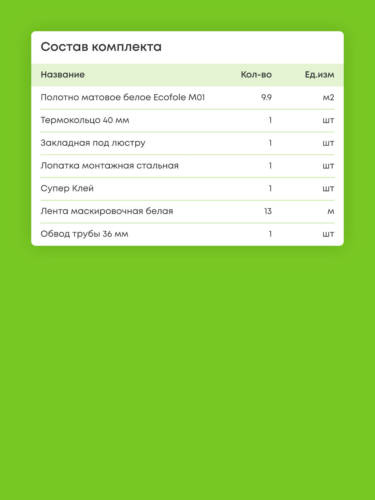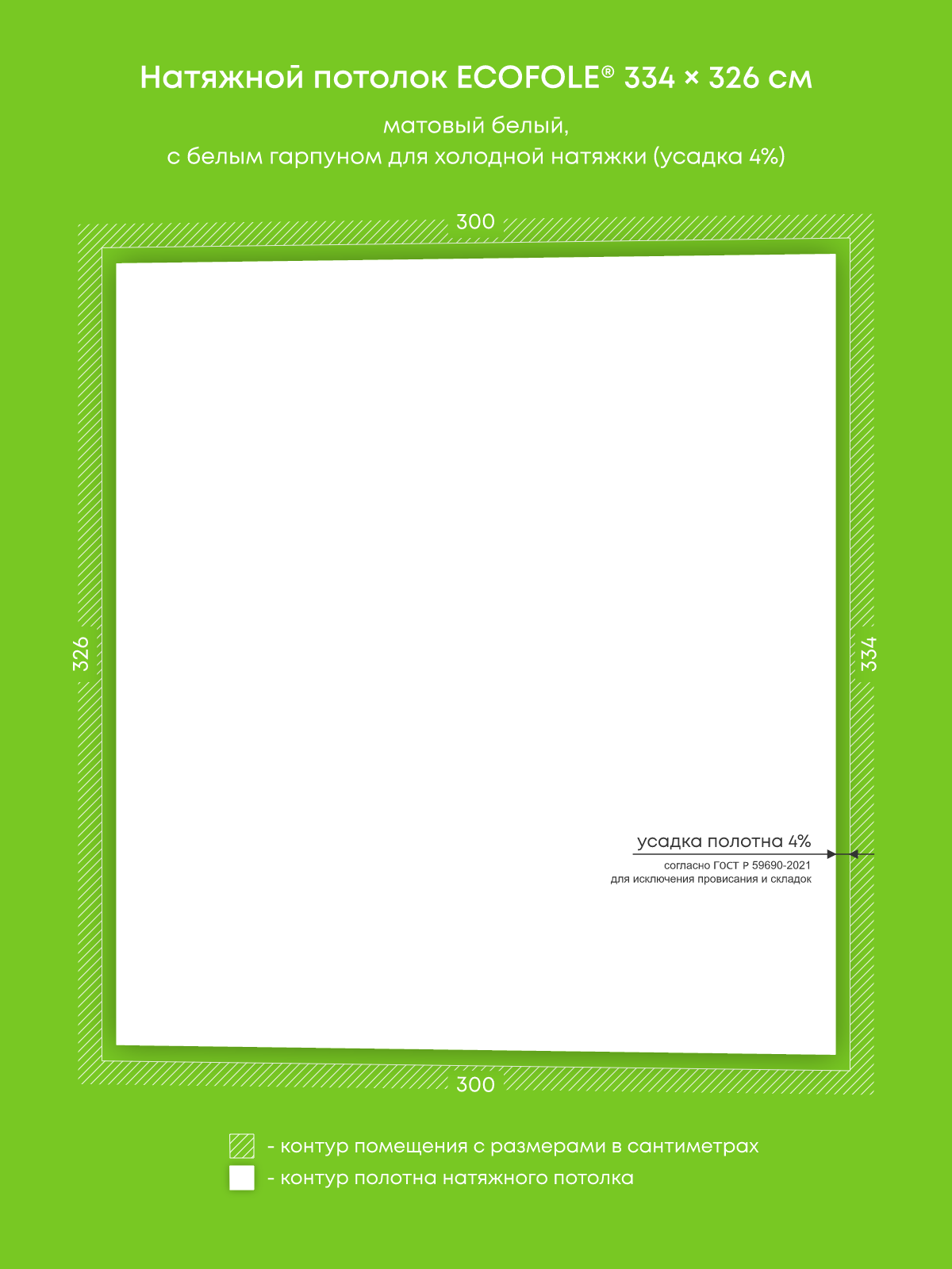 Натяжной потолок белый матовый, изготовленный по индивидуальным размерам покупателя, для помещения площадью 9.9 м2