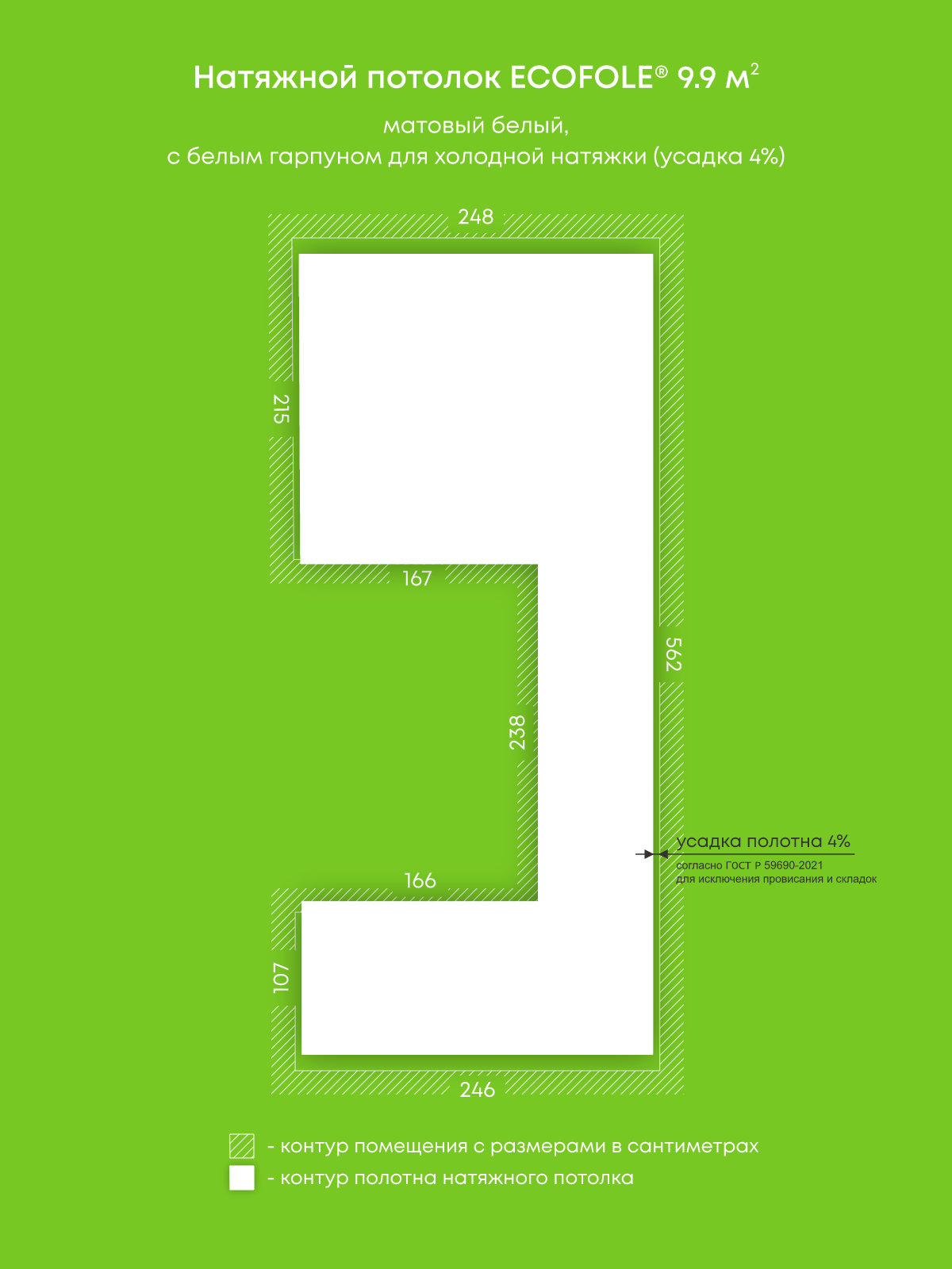 Натяжной потолок белый матовый, изготовленный по индивидуальным размерам покупателя, для помещения площадью 9.9 м2
