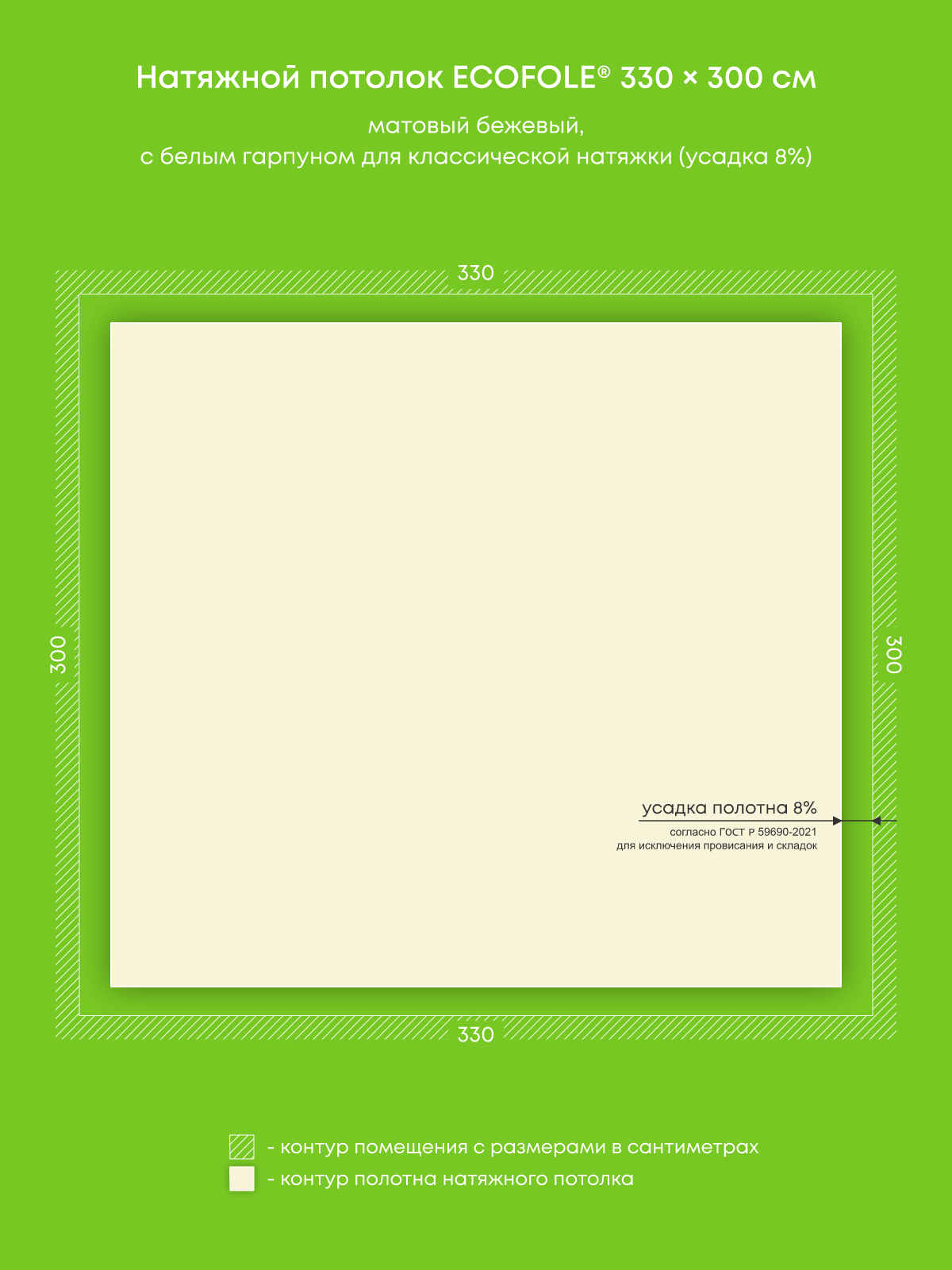 Натяжной потолок бежевый матовый, изготовленный по индивидуальным размерам покупателя, для спальни площадью 9.9 м2