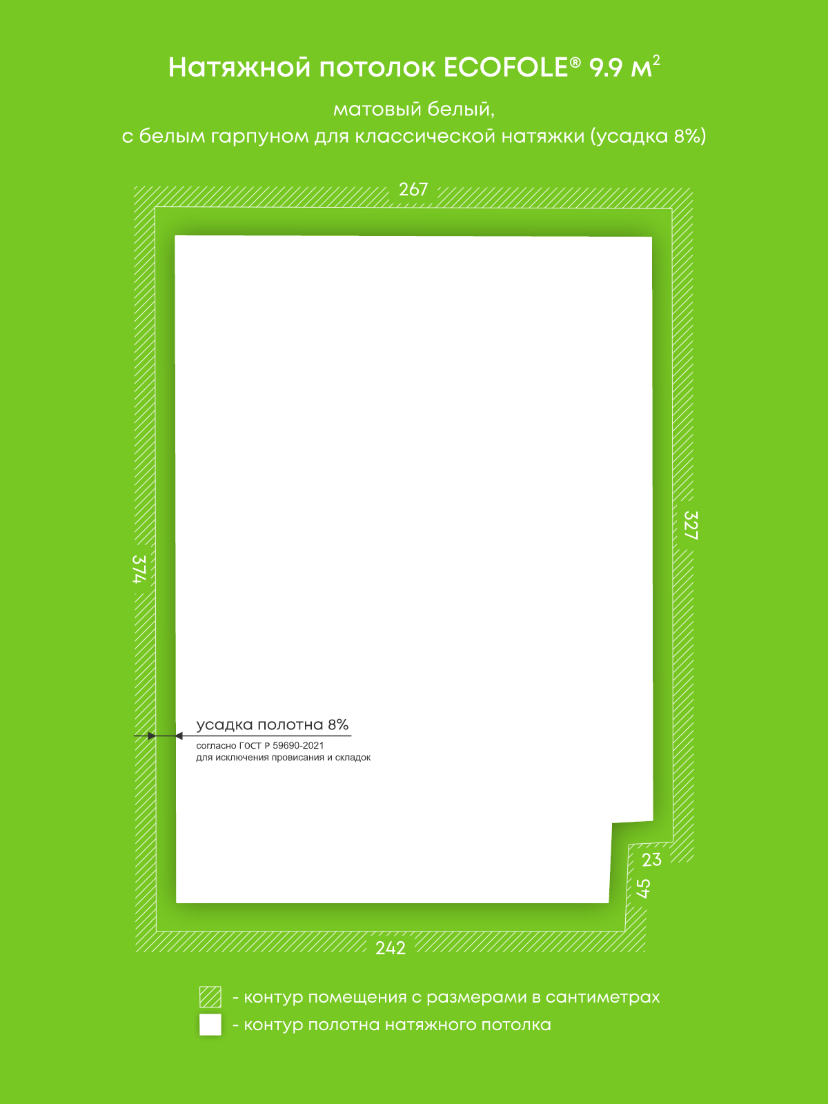 Натяжной потолок белый матовый, изготовленный по индивидуальным размерам покупателя, для помещения площадью 9.9 м2