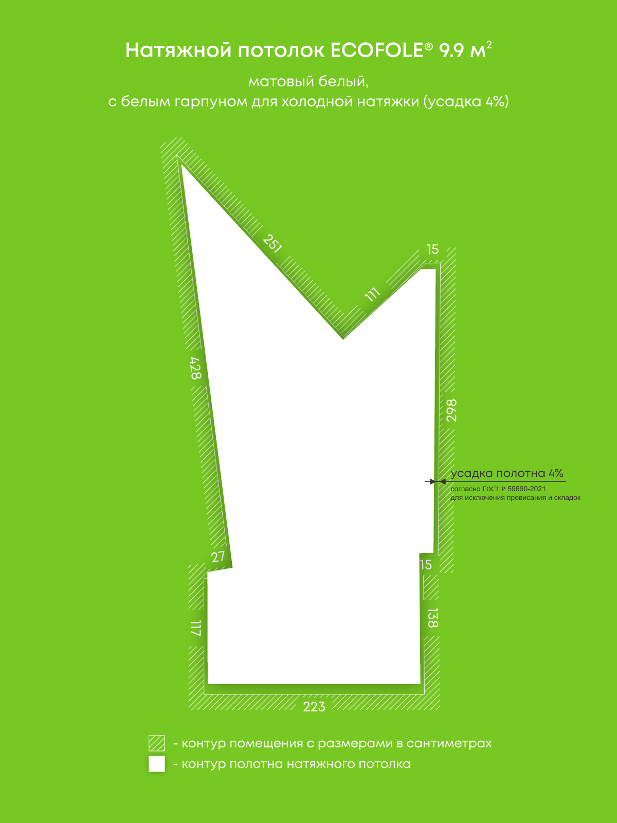Натяжной потолок белый матовый, изготовленный по индивидуальным размерам покупателя, для помещения площадью 9.9 м2