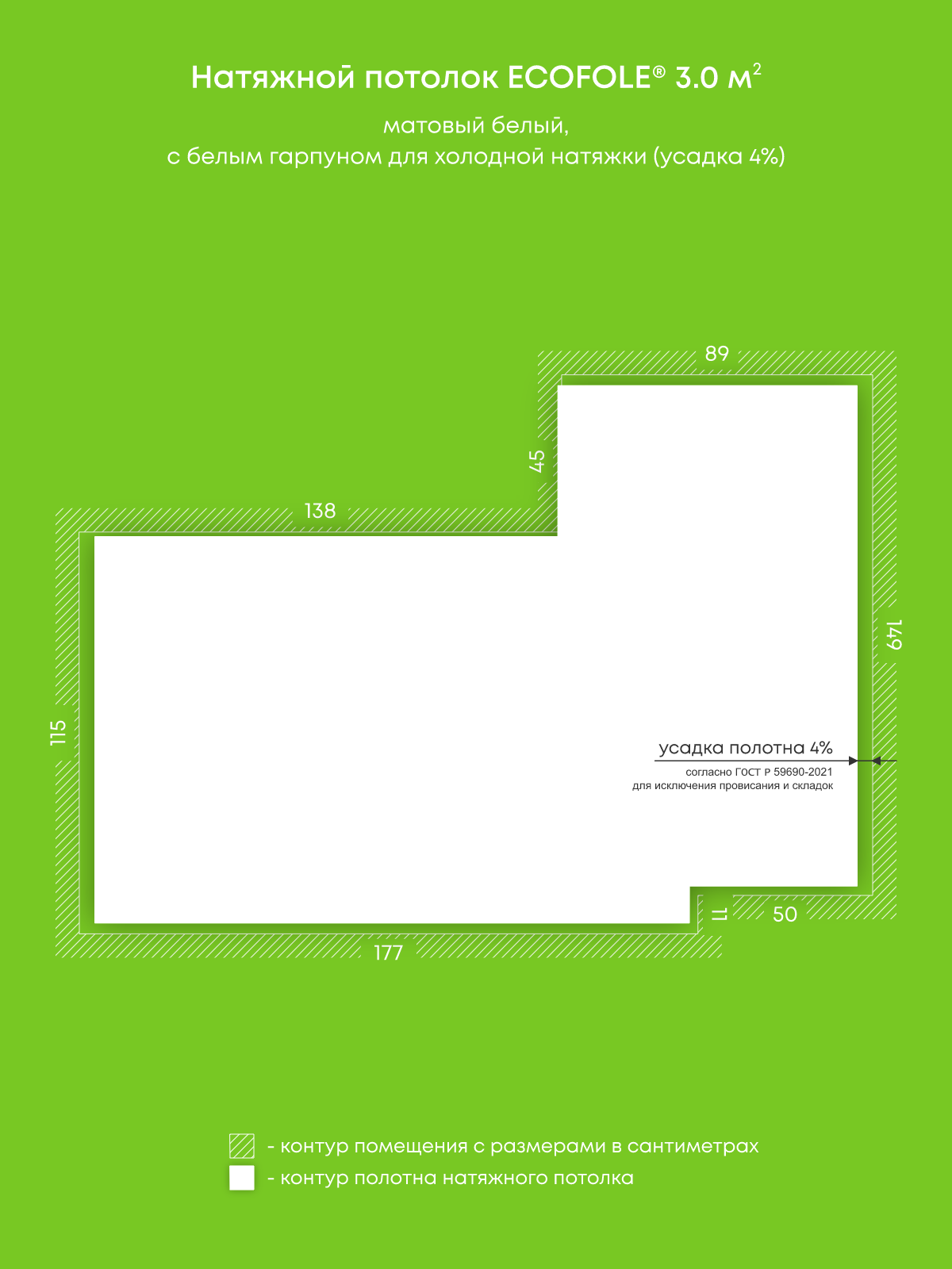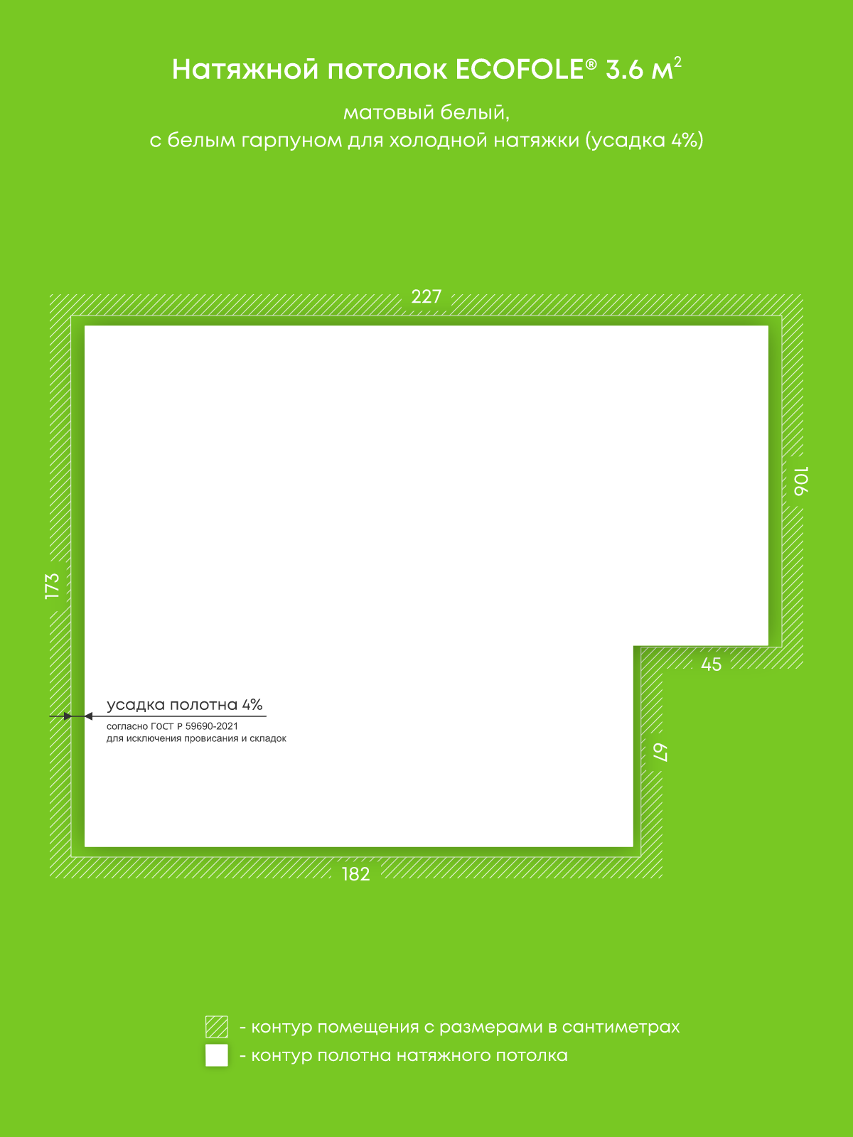 Натяжные потолки, изготовленные по индивидуальным размерам покупателя, для четырех помещений площадью 10.4 м2, 14.1 м2, 3.6 м2, 3 м2