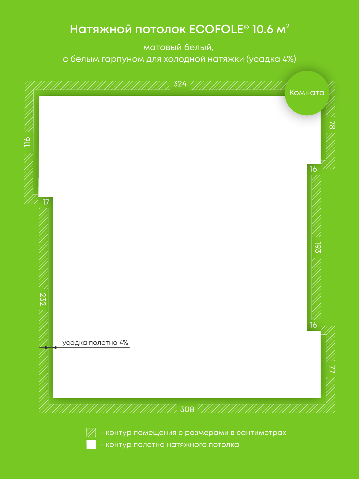 Натяжные потолки изготовленные по индивидуальным размерам покупателя, для трех помещений площадью: 10.6 м2, 3.8 м2, 3.1 м2
