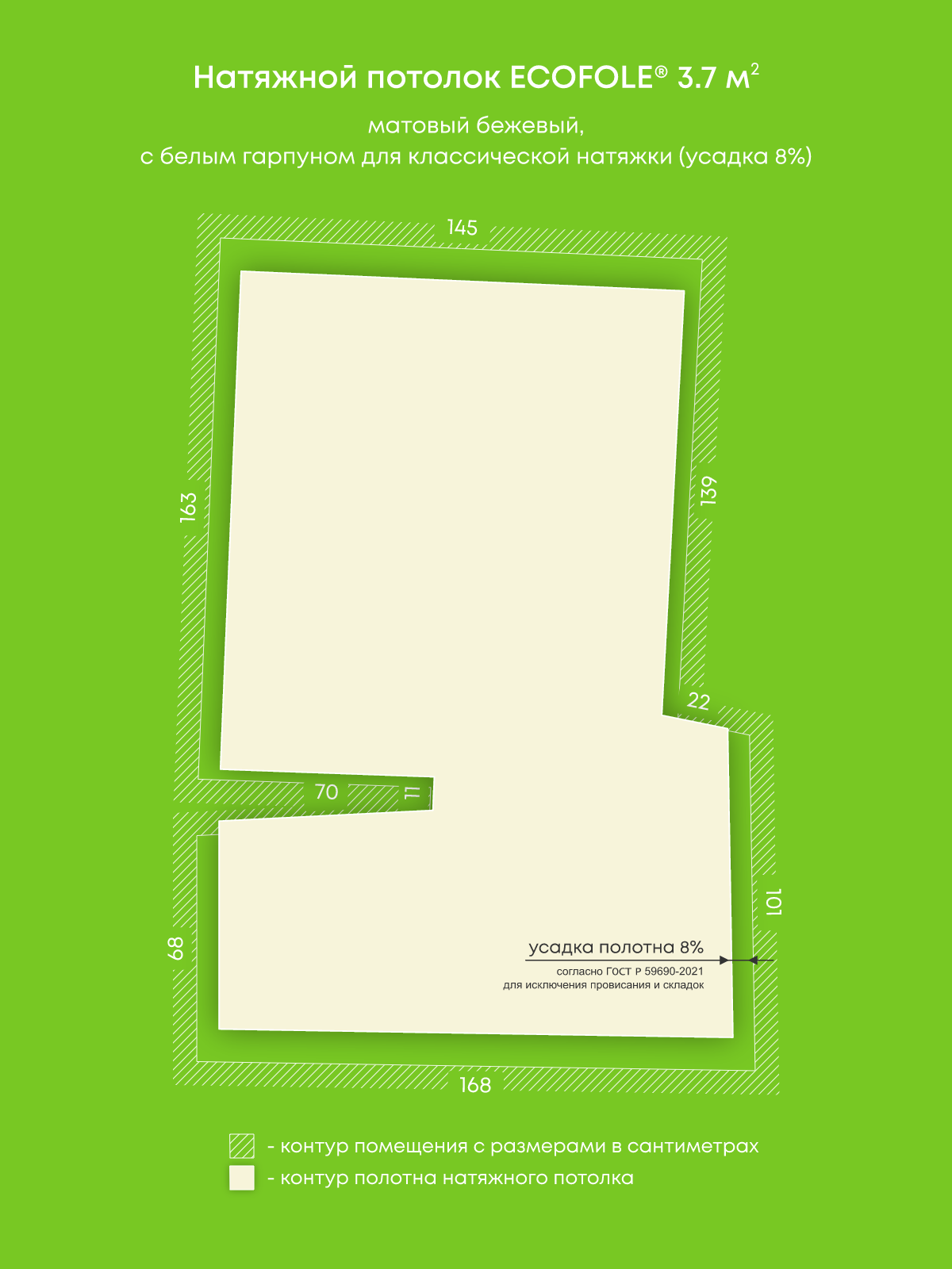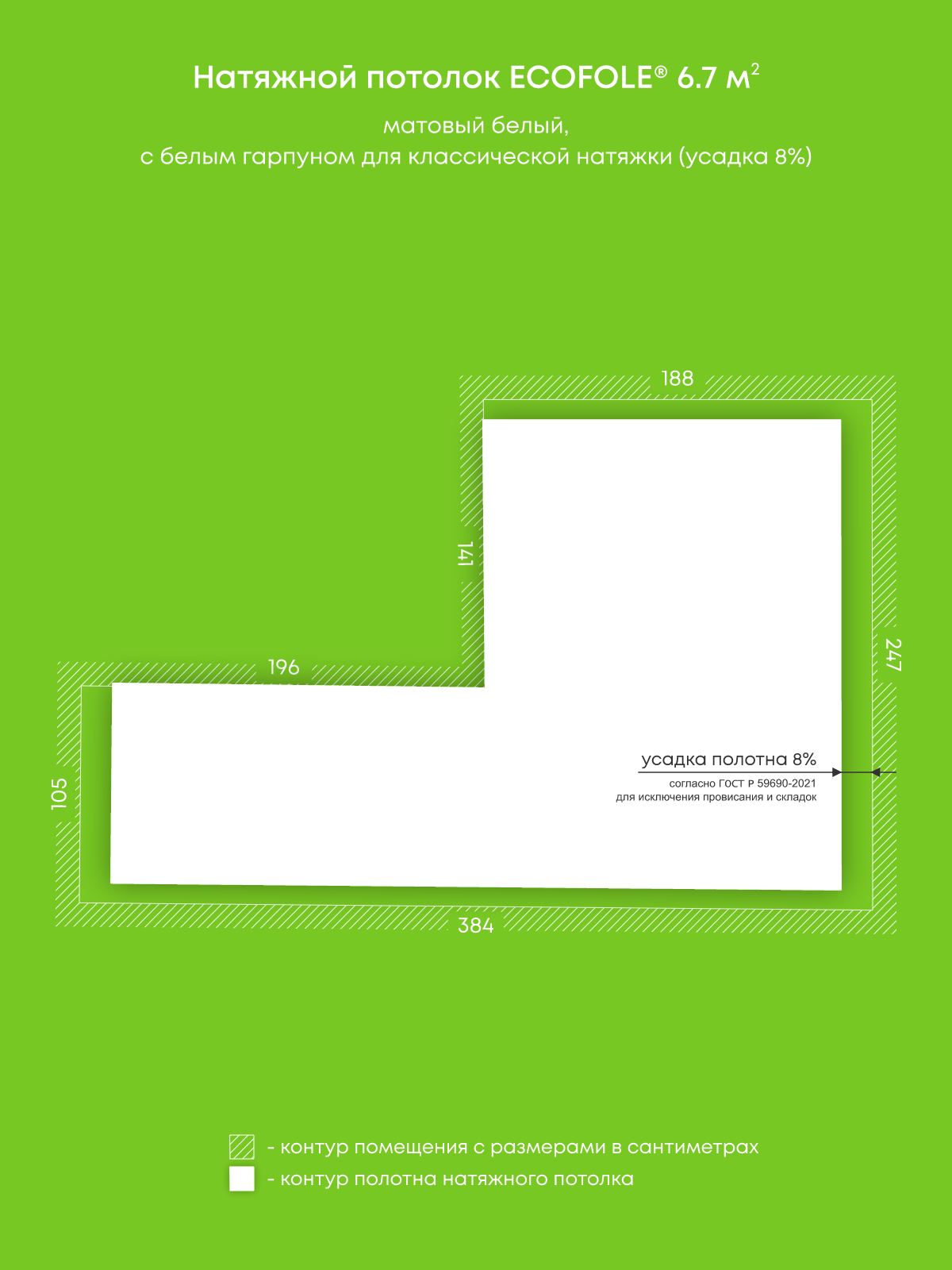 Натяжные потолки, изготовленные по индивидуальным размерам покупателя, для трех помещений площадью 10.8 м2, 3.7 м2, 6.7 м2