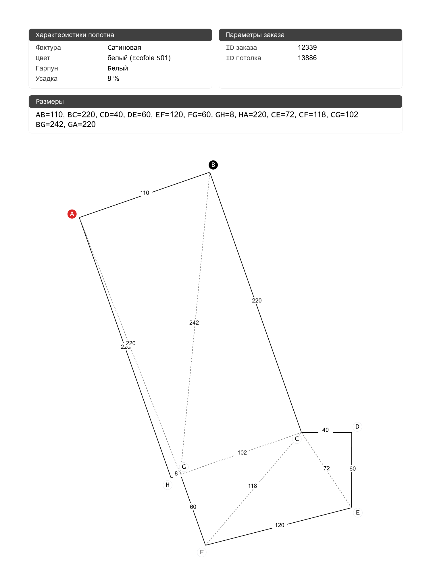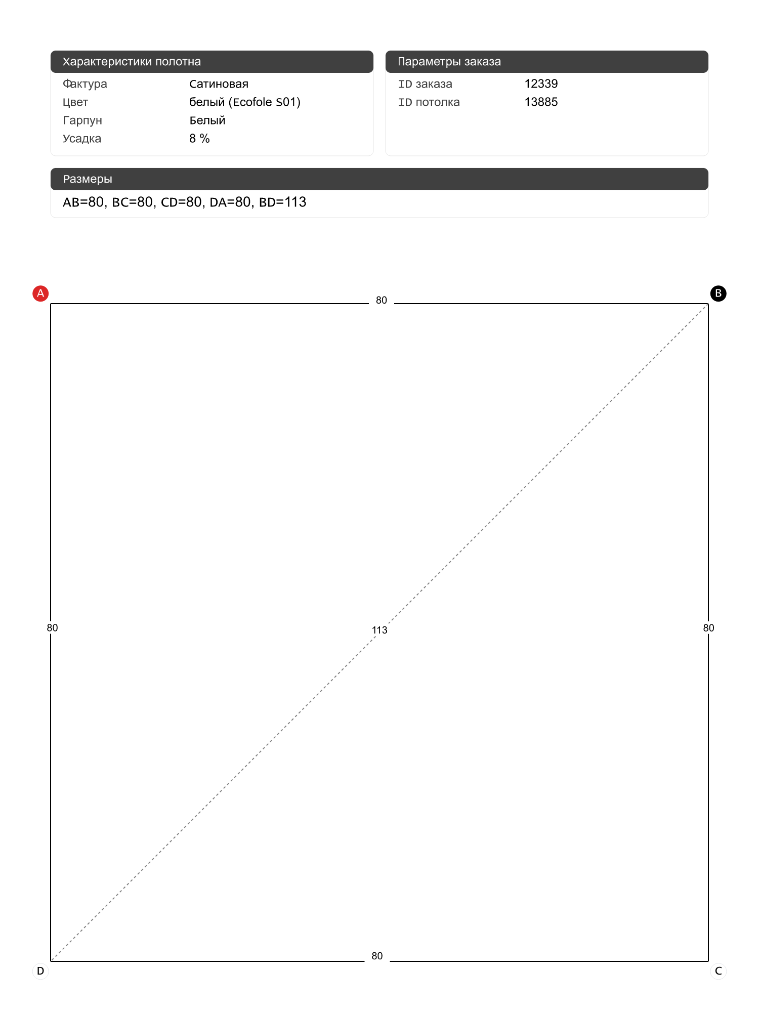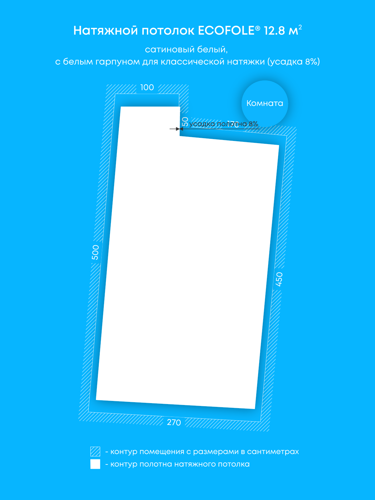 Натяжные потолки изготовленные по индивидуальным размерам покупателя, для четырех помещений площадью: 10.9 м2, 12.8 м2, 0.6 м2, 3.3 м2