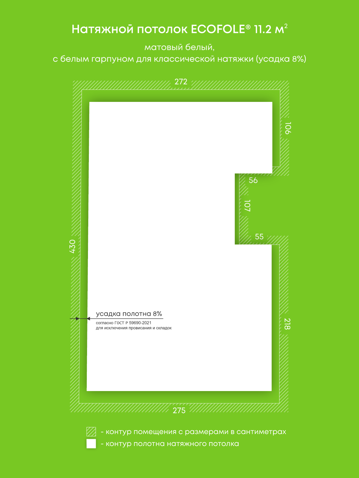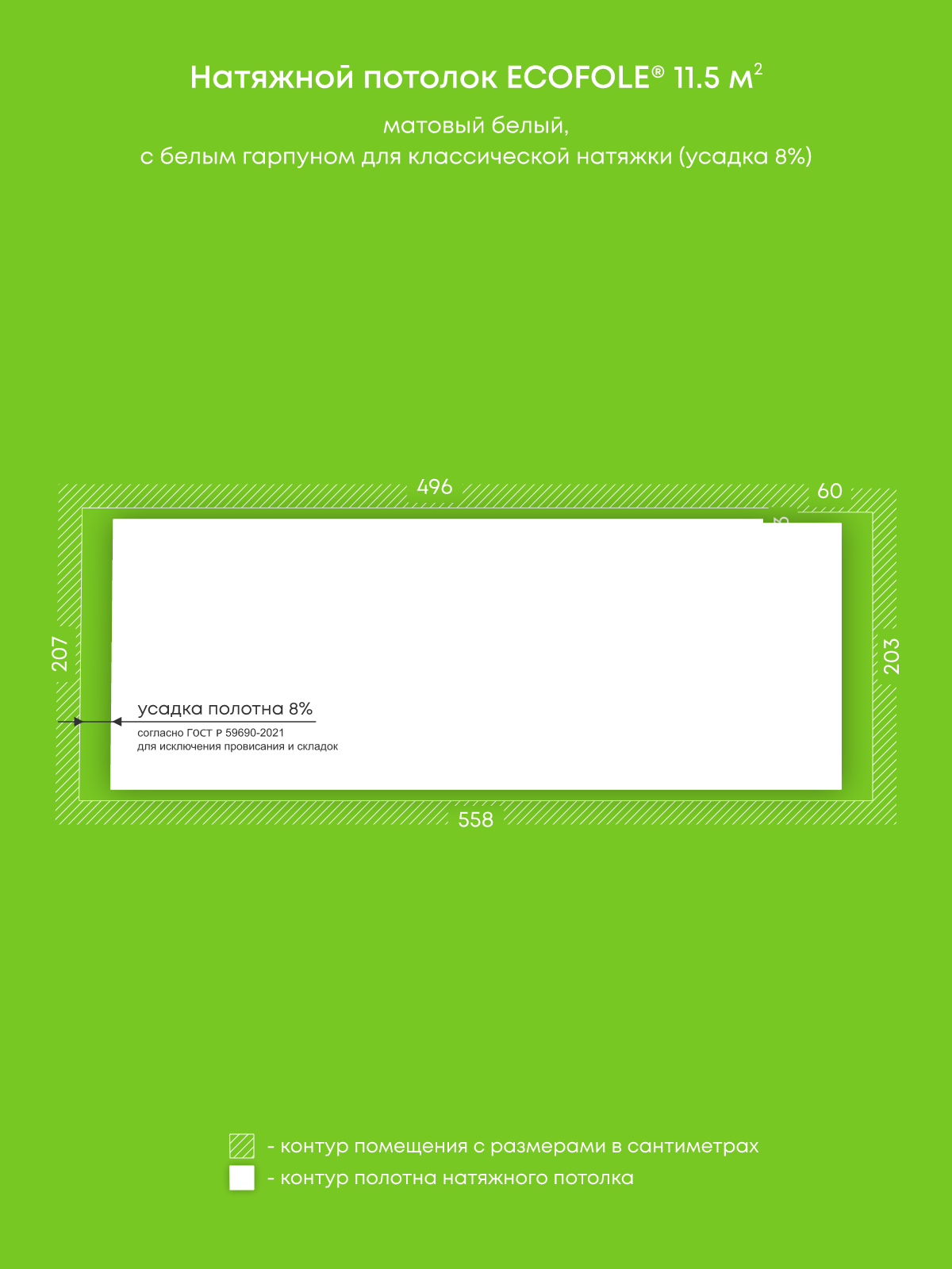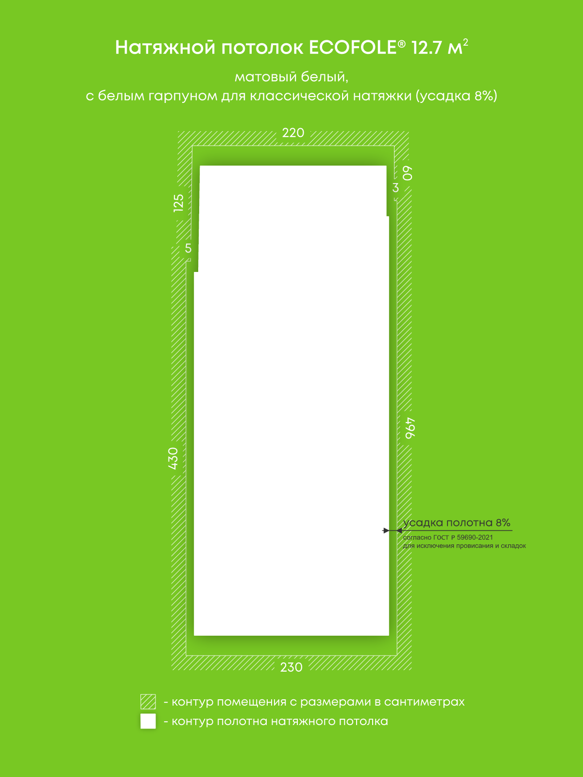 Натяжные потолки, изготовленные по индивидуальным размерам покупателя, для трех помещений площадью 11.5 м2, 12.7 м2, 11.2 м2