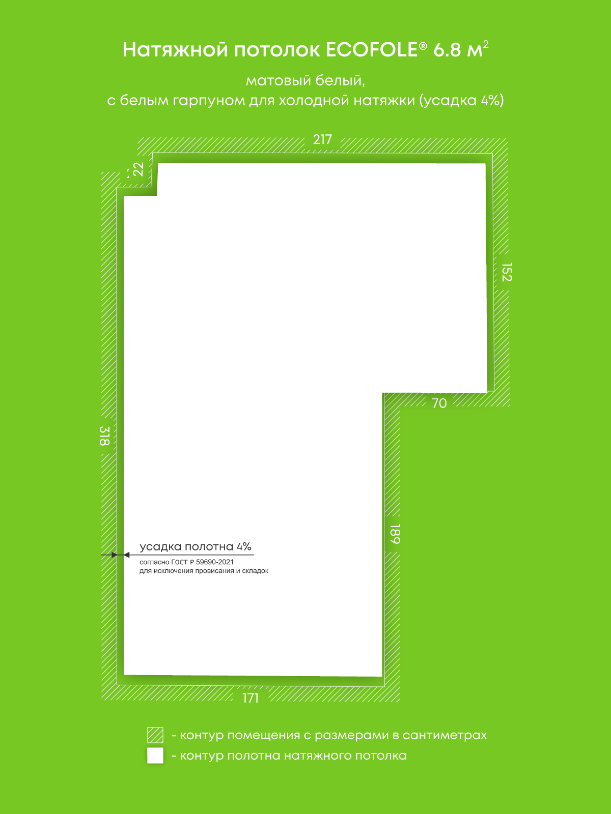Натяжные потолки, изготовленные по индивидуальным размерам покупателя, для трех помещений площадью 11.5 м2, 6.8 м2, 5.2 м2