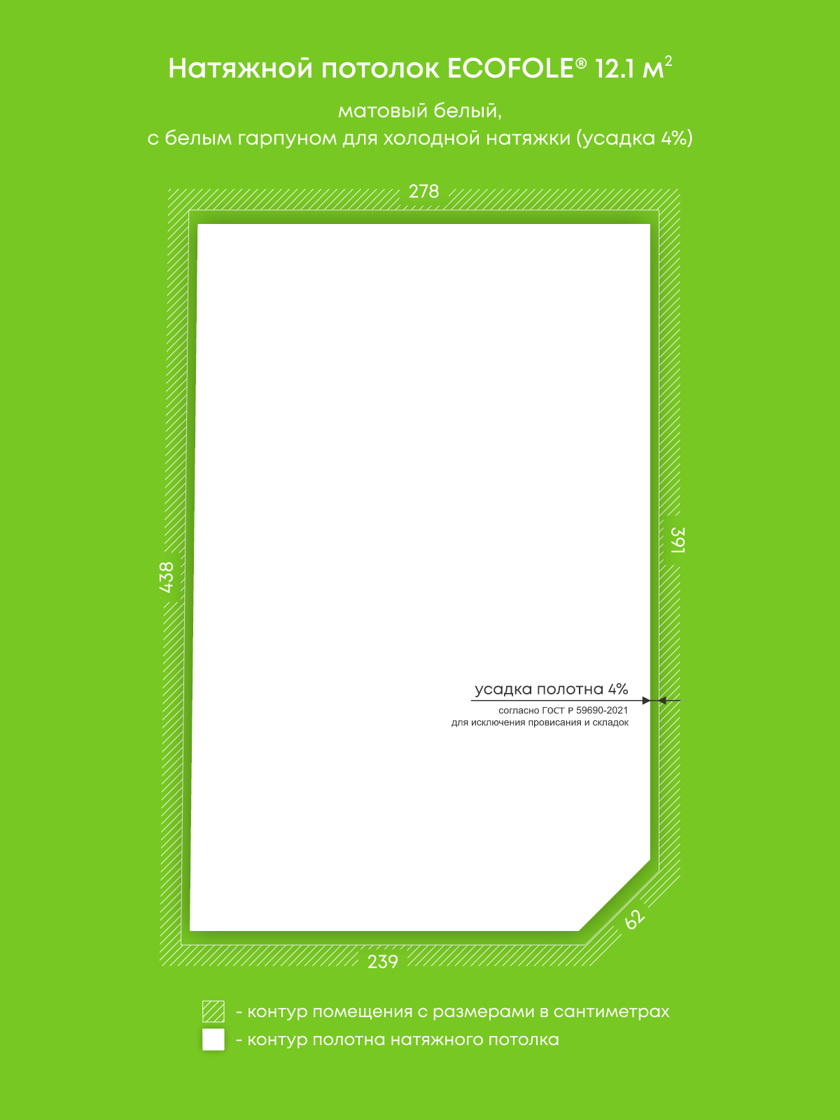 Натяжные потолки, изготовленные по индивидуальным размерам покупателя, для трех помещений площадью 12.1 м2, 1.8 м2, 5.3 м2