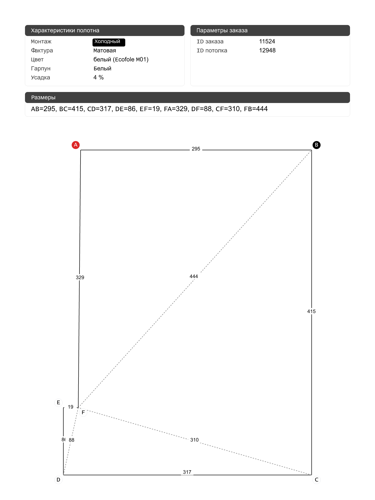 Натяжные потолки изготовленные по индивидуальным размерам покупателя, для двух помещений площадью: 12.5 м2, 12.5 м2