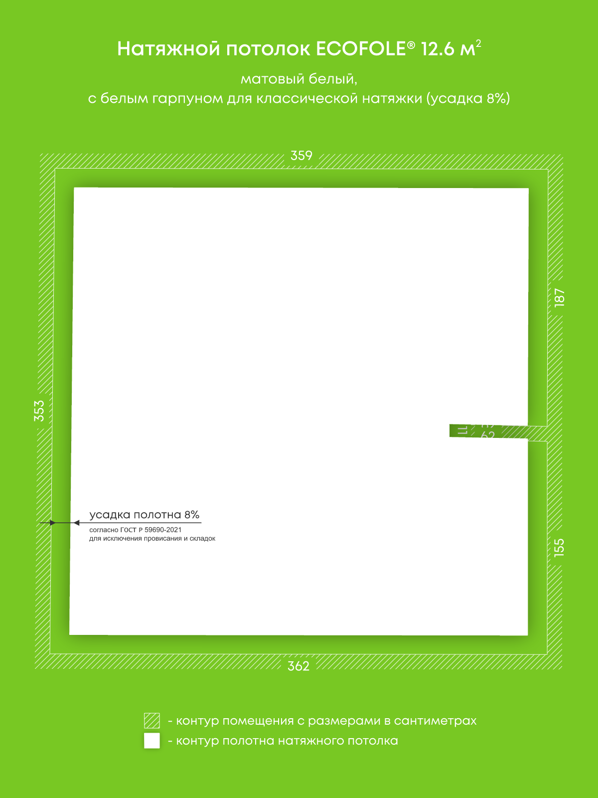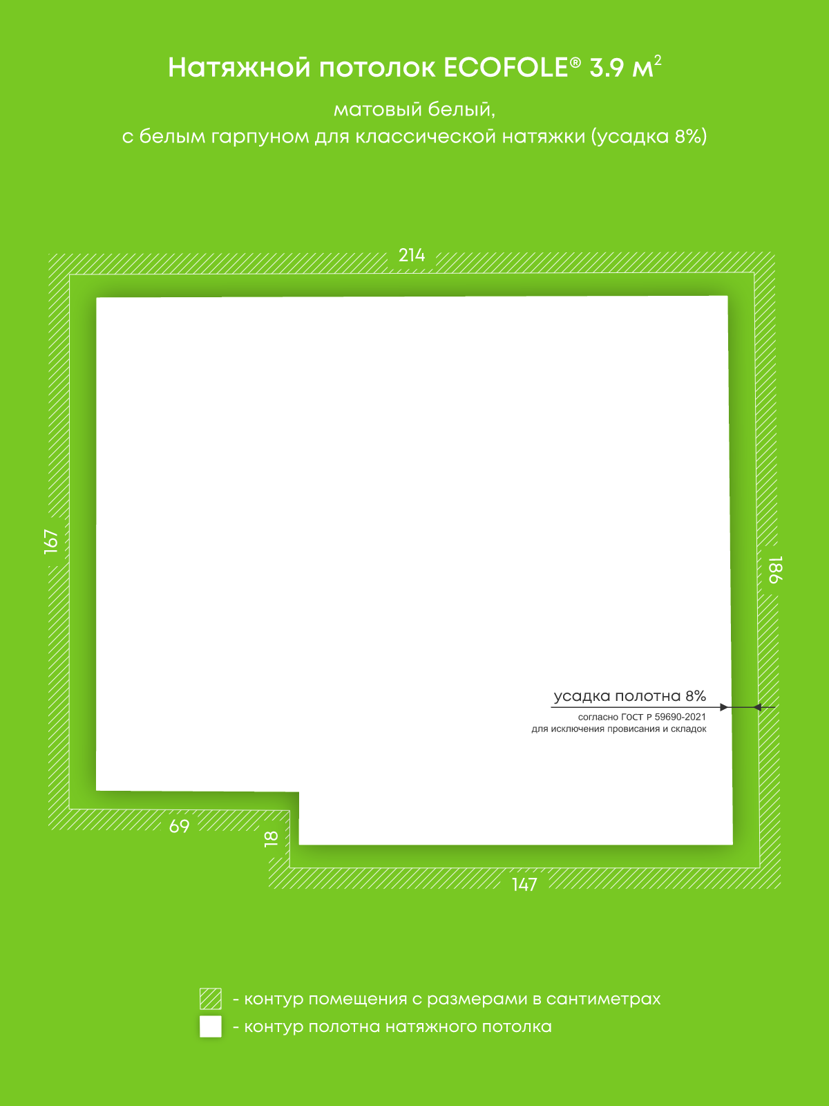 Натяжные потолки, изготовленные по индивидуальным размерам покупателя, для трех помещений площадью 12.6 м2, 3.9 м2, 3.4 м2