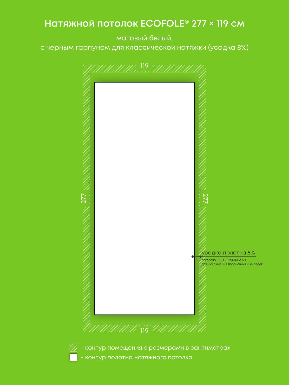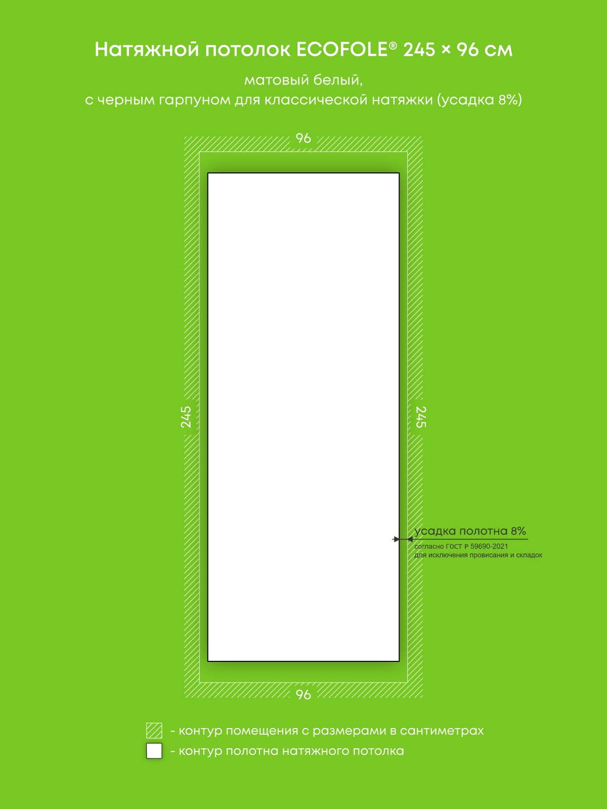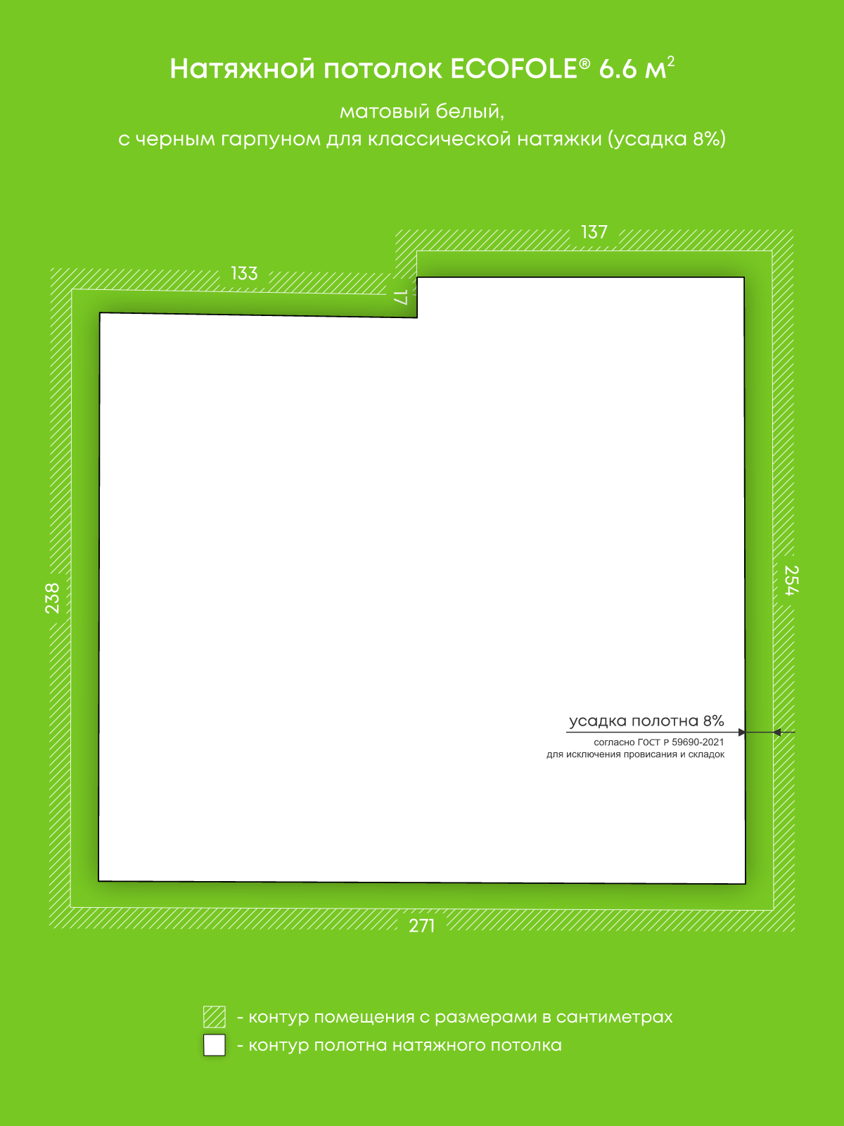 Натяжные потолки, изготовленные по индивидуальным размерам покупателя, для пяти помещений площадью 12.6 м2, 5.4 м2, 3.3 м2, 2.4 м2, 6.6 м2