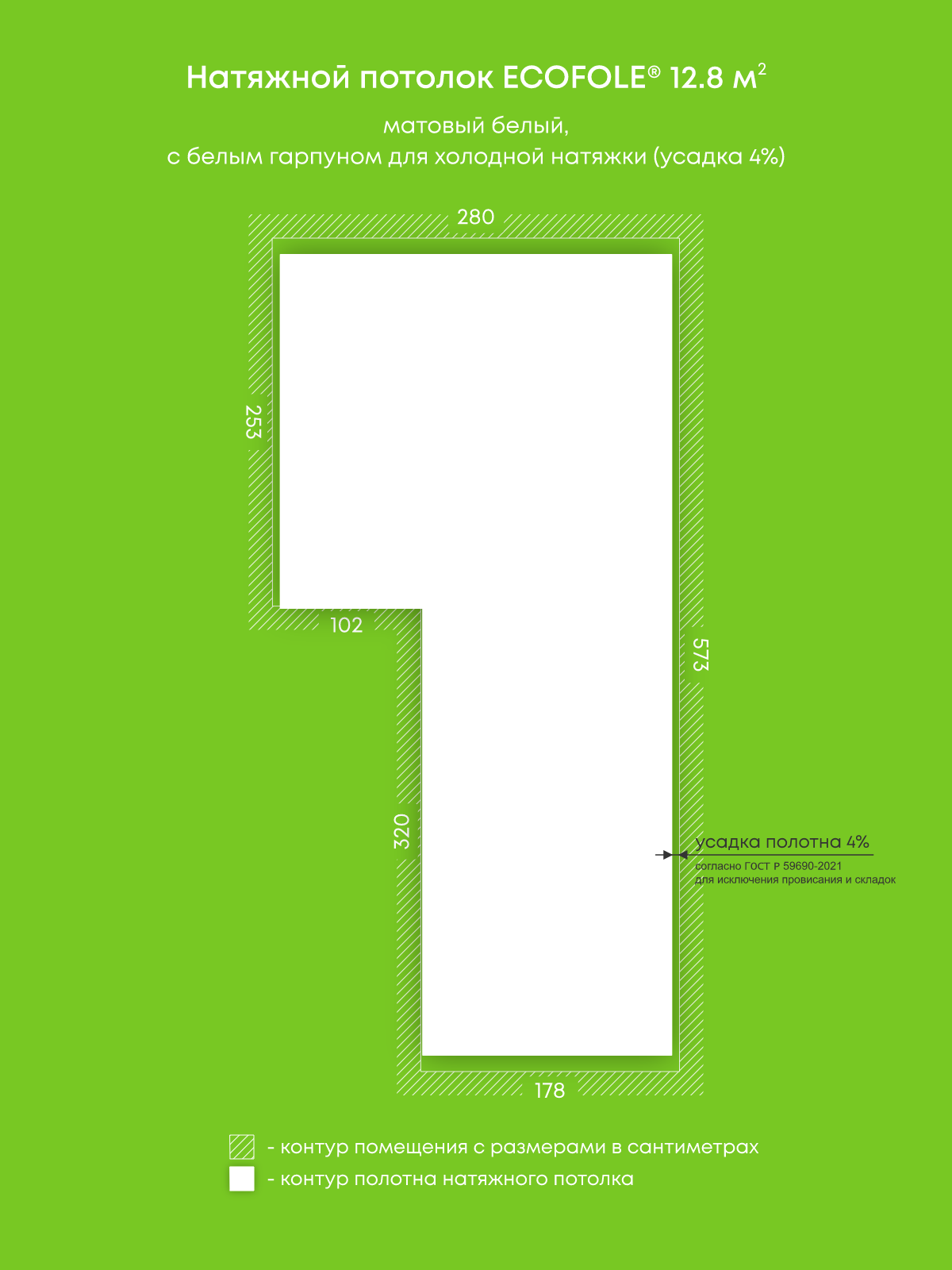Натяжные потолки, изготовленные по индивидуальным размерам покупателя, для четырех помещений площадью 12.8 м2, 12.3 м2, 11.9 м2, 12.2 м2