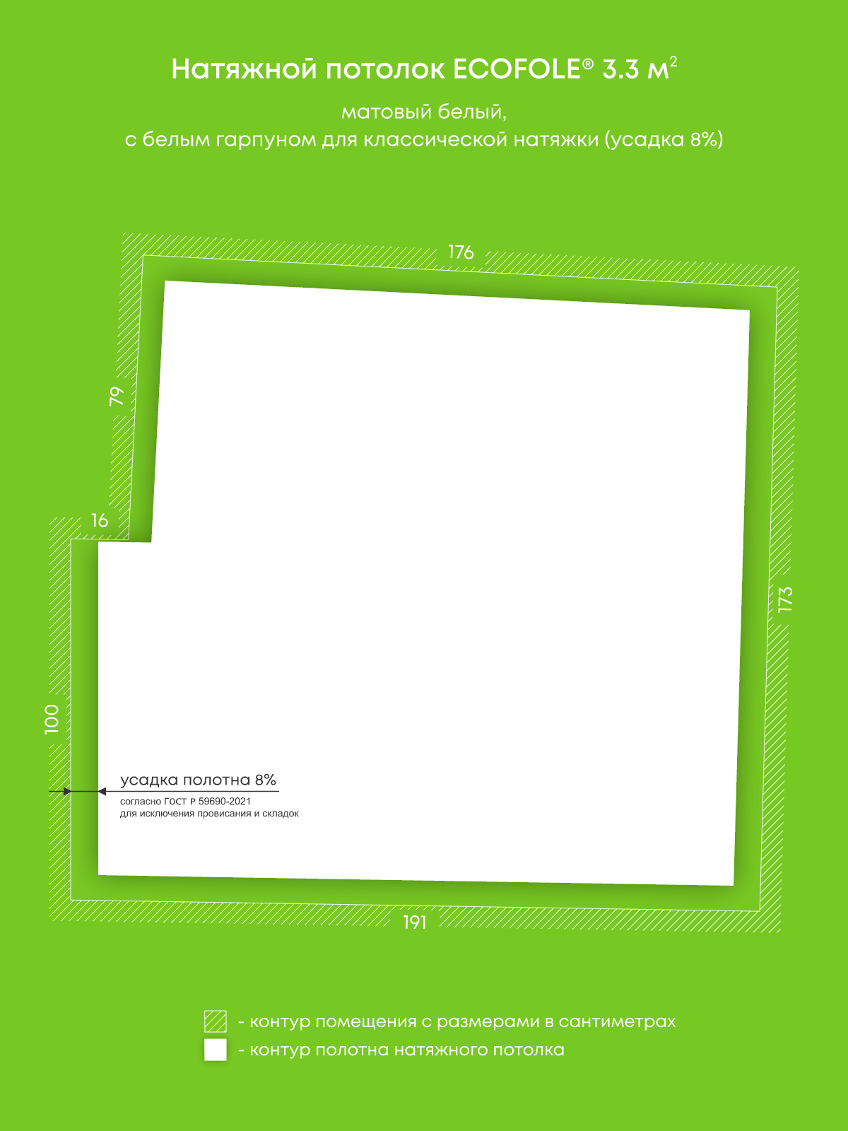 Натяжные потолки, изготовленные по индивидуальным размерам покупателя, для четырех помещений площадью 13 м2, 0.9 м2, 3.3 м2, 1.1 м2