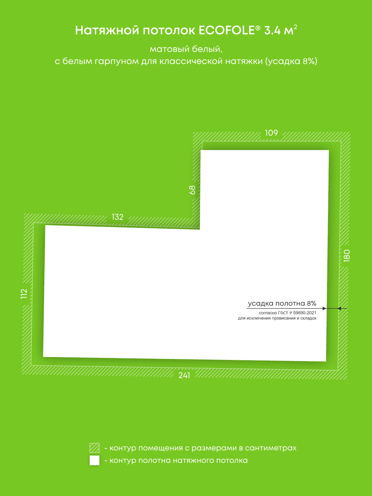 Натяжные потолки, изготовленные по индивидуальным размерам покупателя, для пяти помещений площадью 13 м2, 9.4 м2, 7.4 м2, 3.8 м2, 10.8 м2, 3.4 м2