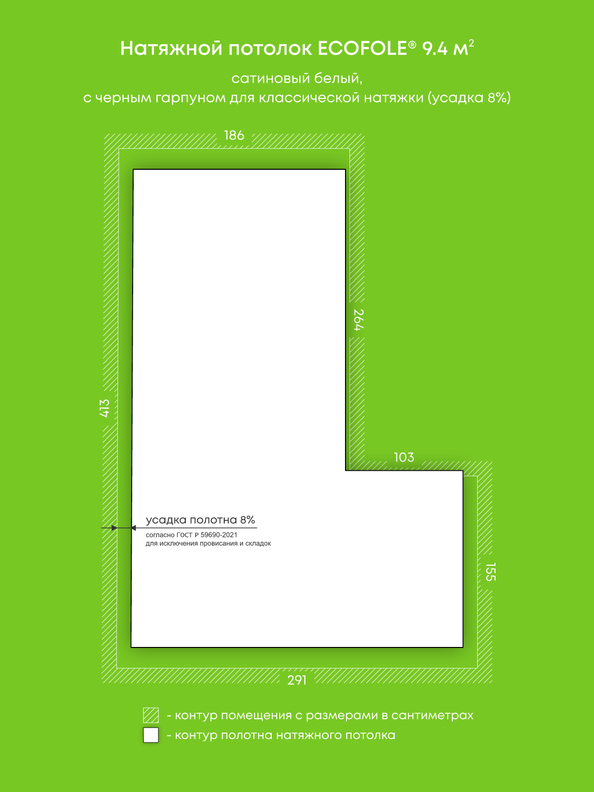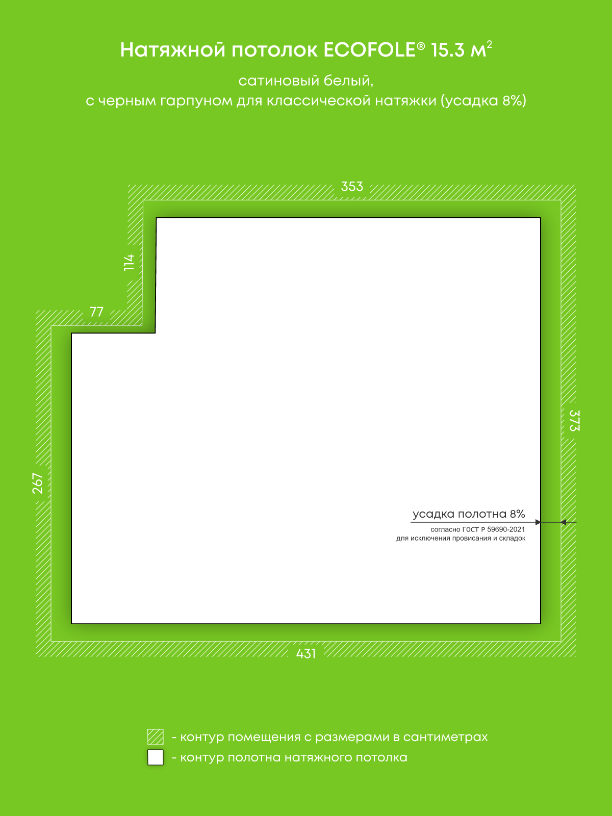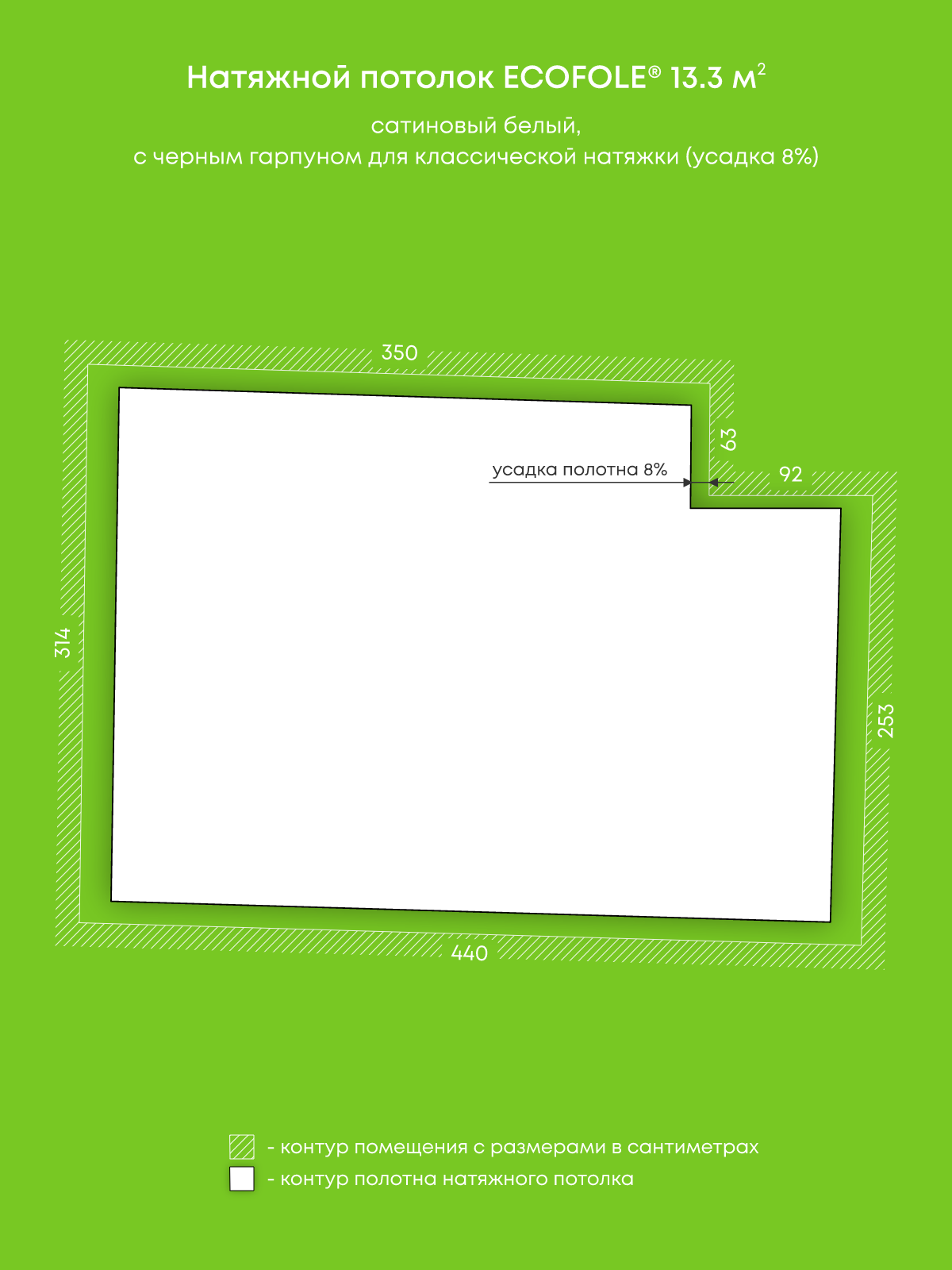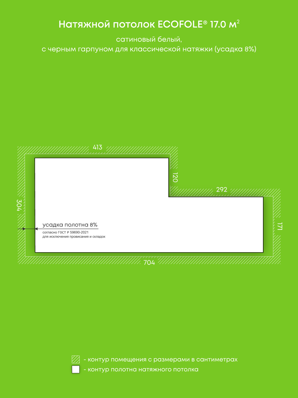 Натяжные потолки, изготовленные по индивидуальным размерам покупателя, для четырех помещений площадью 13.3 м2, 15.3 м2, 17 м2, 9.4 м2