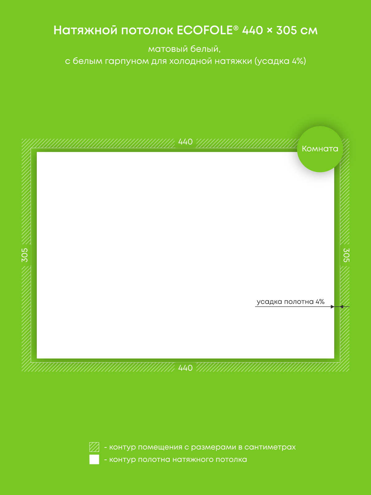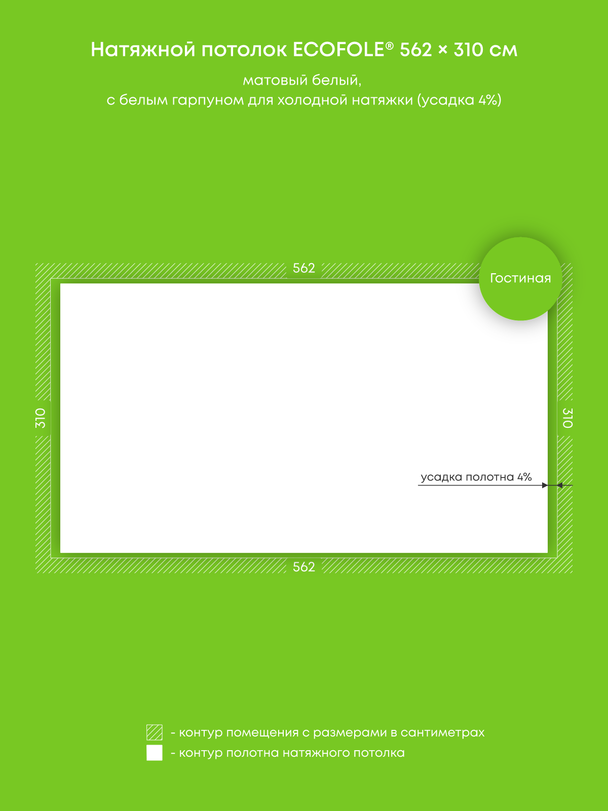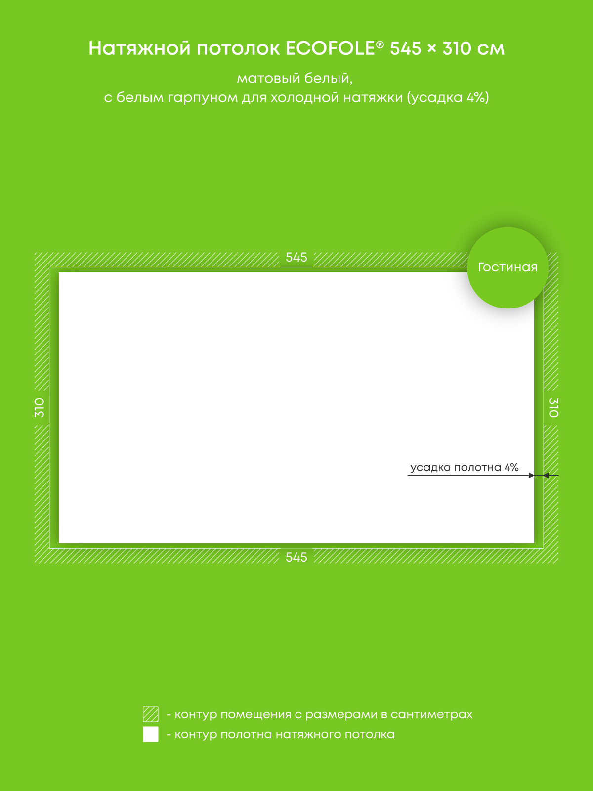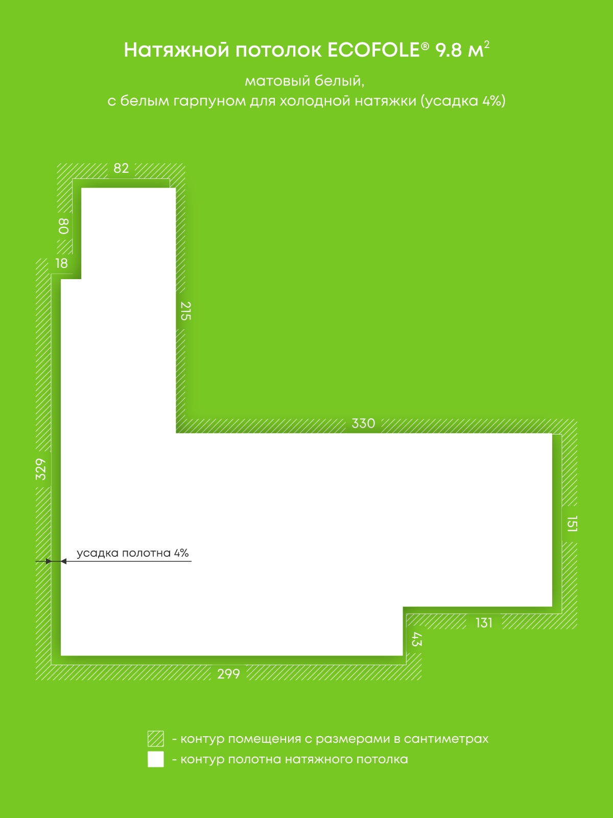 Натяжные потолки, изготовленные по индивидуальным размерам покупателя, для четырех помещений площадью 13.4 м2, 16.9 м2, 9.8 м2, 17.4 м2