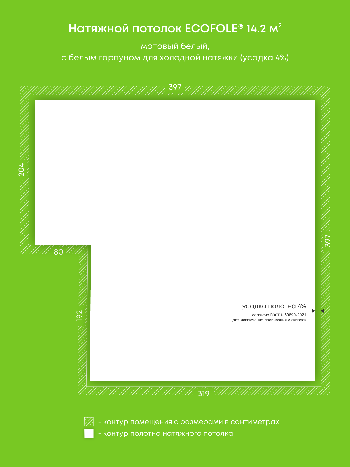 Натяжные потолки, изготовленные по индивидуальным размерам покупателя, для двух помещений площадью 14.2 м2, 2.1 м2