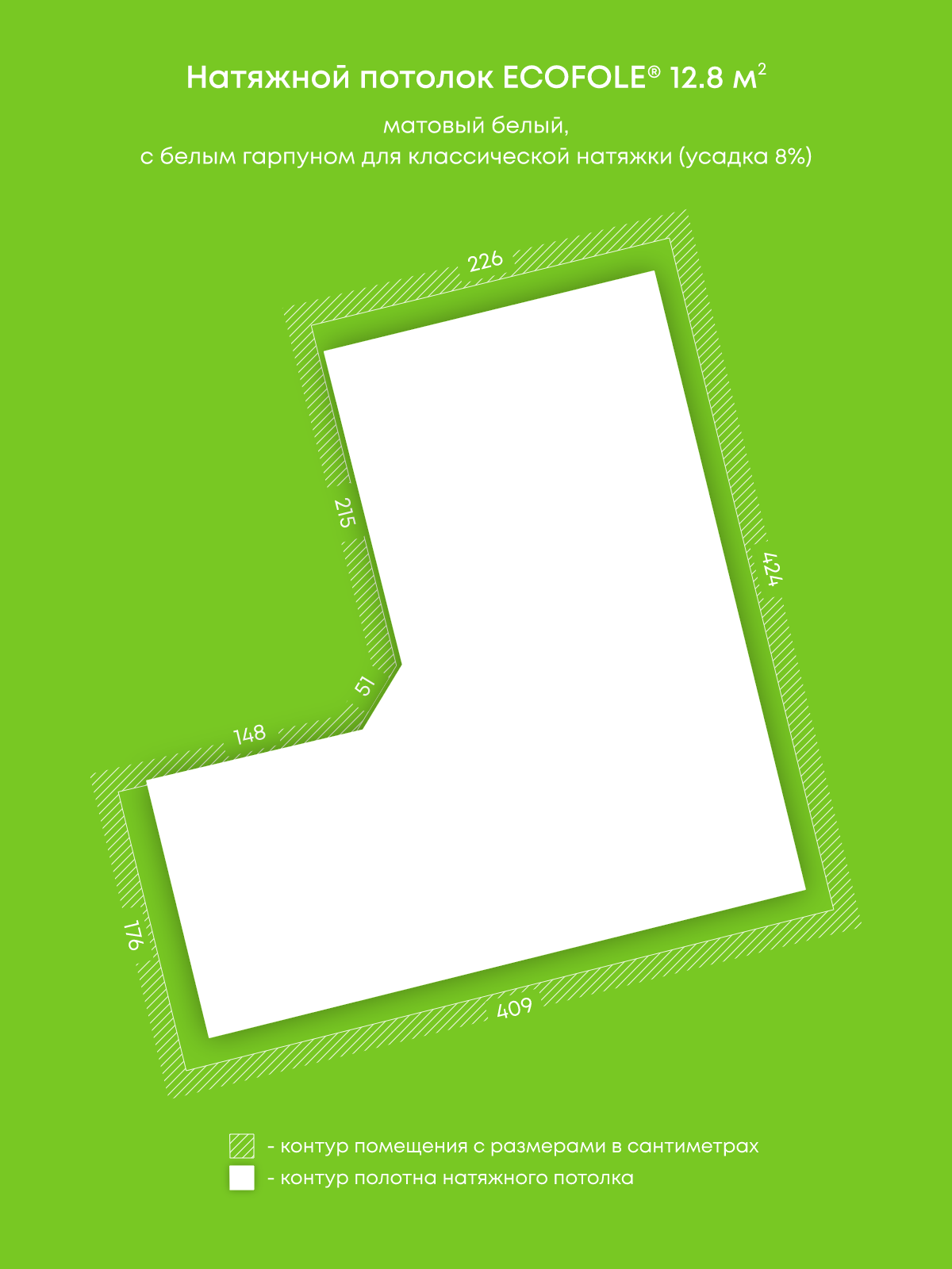 Натяжные потолки, изготовленные по индивидуальным размерам покупателя, для четырех помещений площадью 15.4 м2, 21.2 м2, 12.2 м2, 12.8 м2