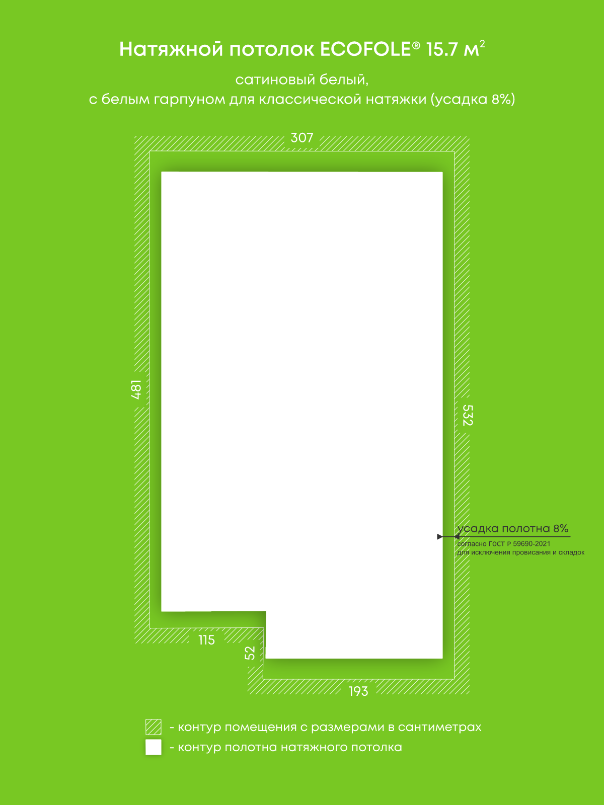 Натяжные потолки, изготовленные по индивидуальным размерам покупателя, для четырех помещений площадью 15.7 м2, 17.4 м2, 17.4 м2, 16.1 м2