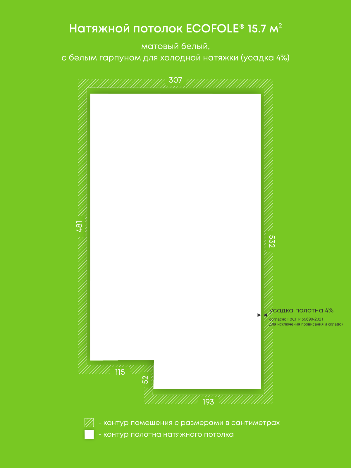 Натяжные потолки, изготовленные по индивидуальным размерам покупателя, для четырех помещений площадью 15.7 м2, 17.4 м2, 17.4 м2, 16.1 м2