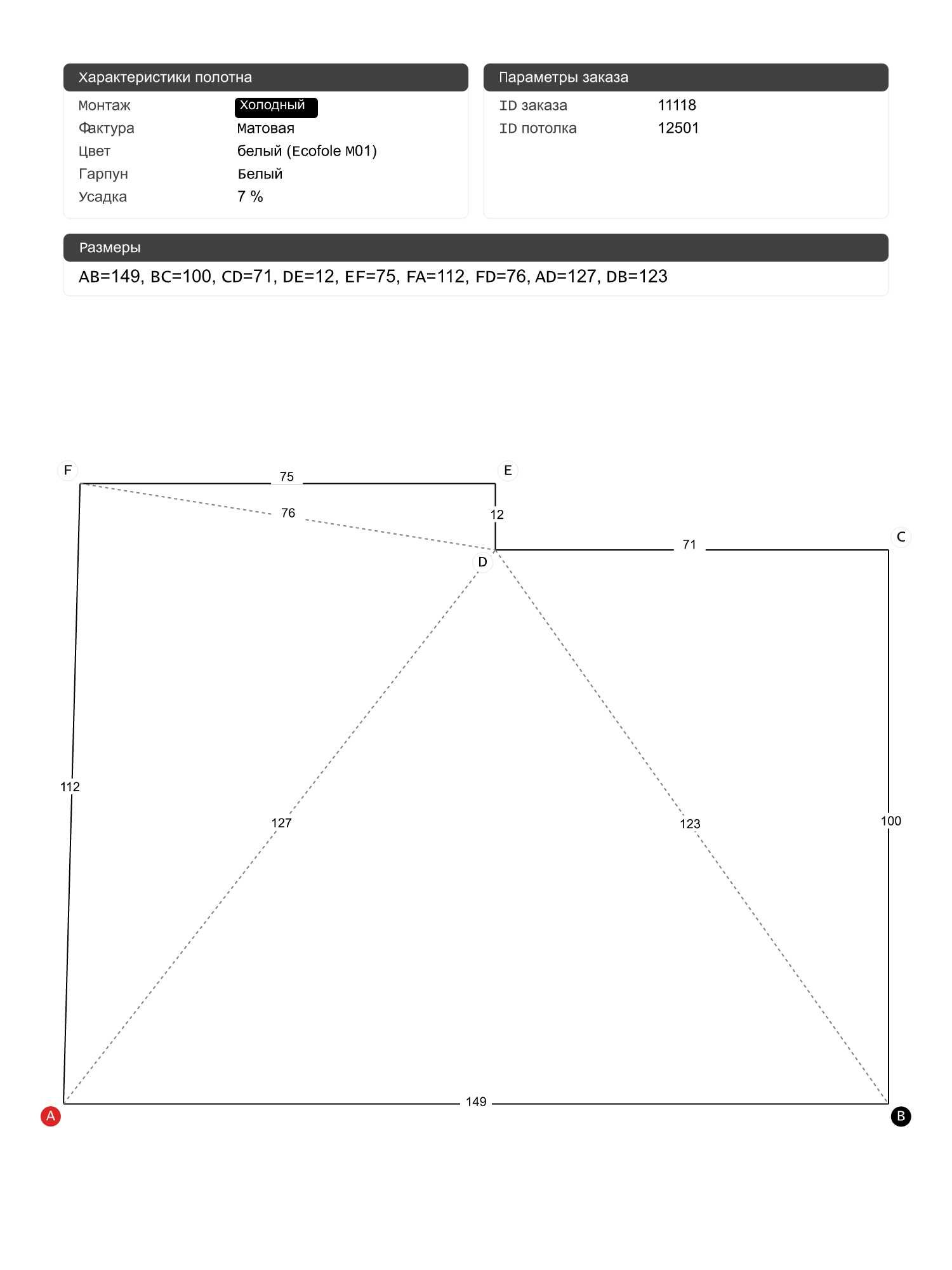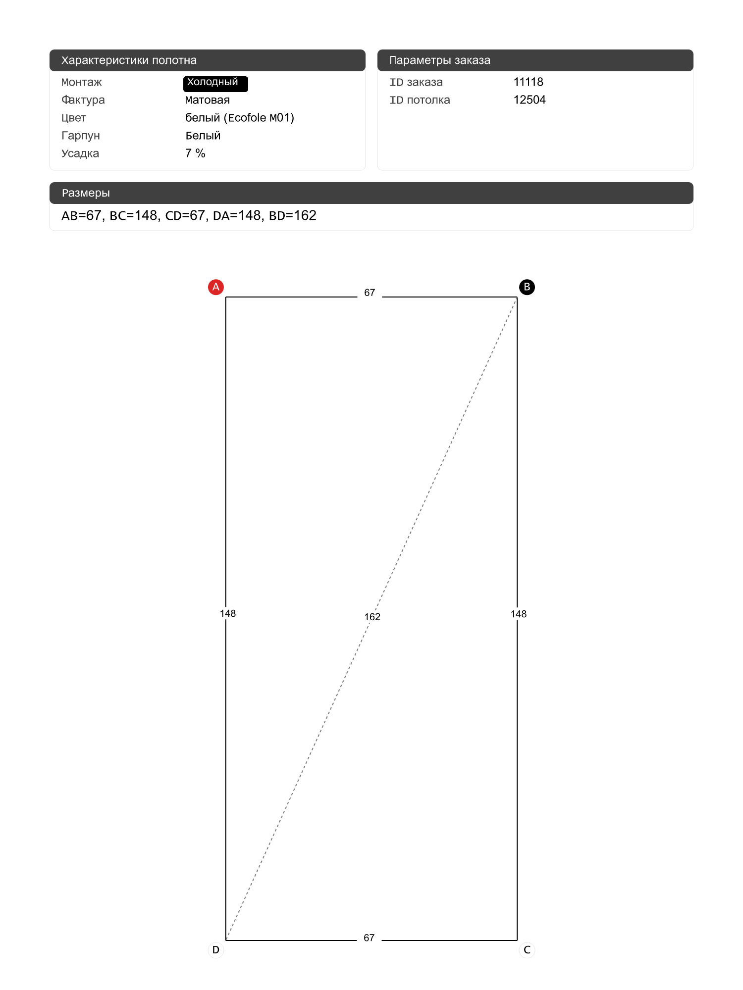 Натяжные потолки изготовленные по индивидуальным размерам покупателя, для двух помещений площадью: 1.6 м2, 1 м2