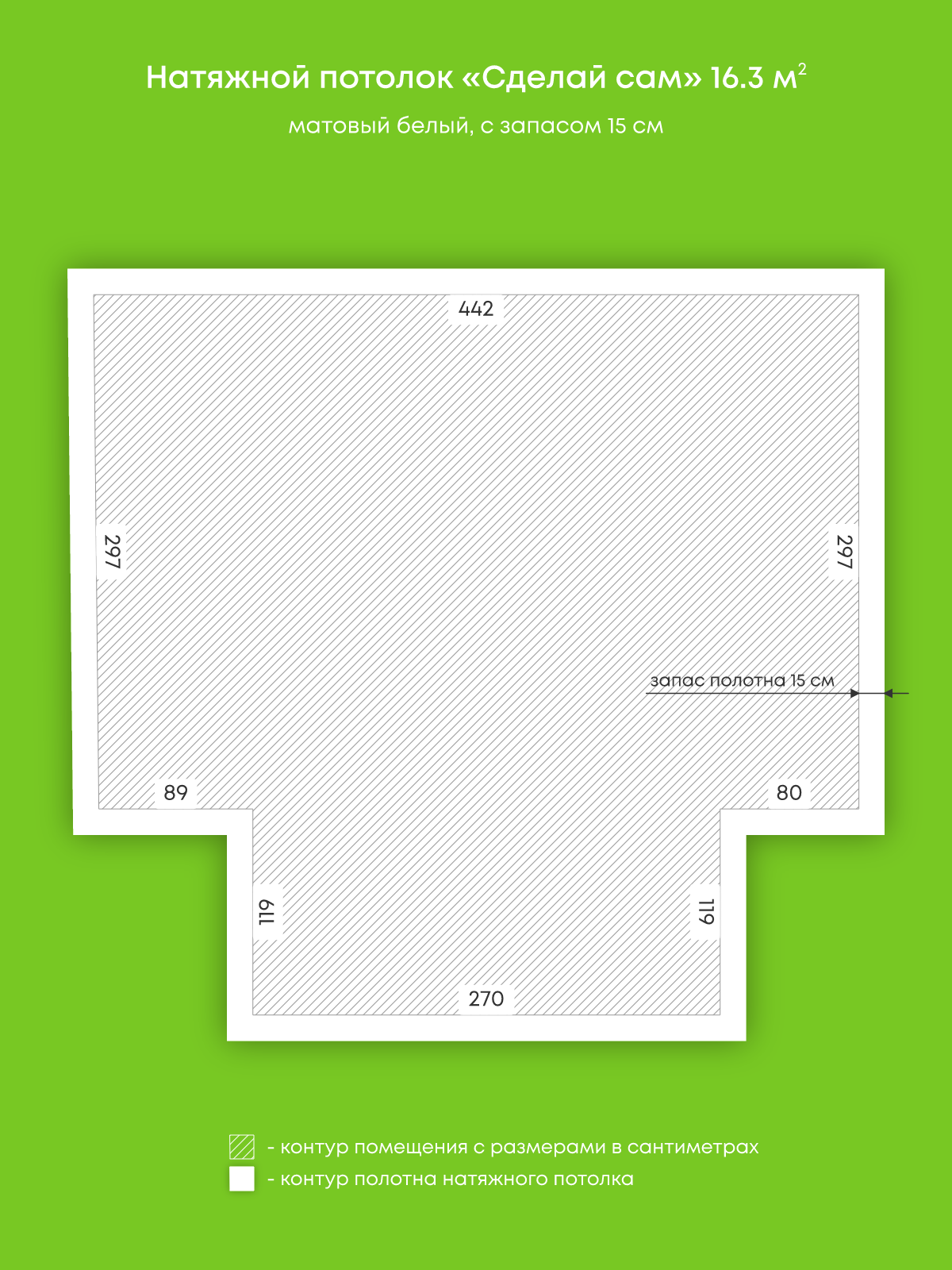 Натяжные потолки, изготовленные по индивидуальным размерам покупателя, для двух помещений площадью 16.3 м2, 15.2 м2