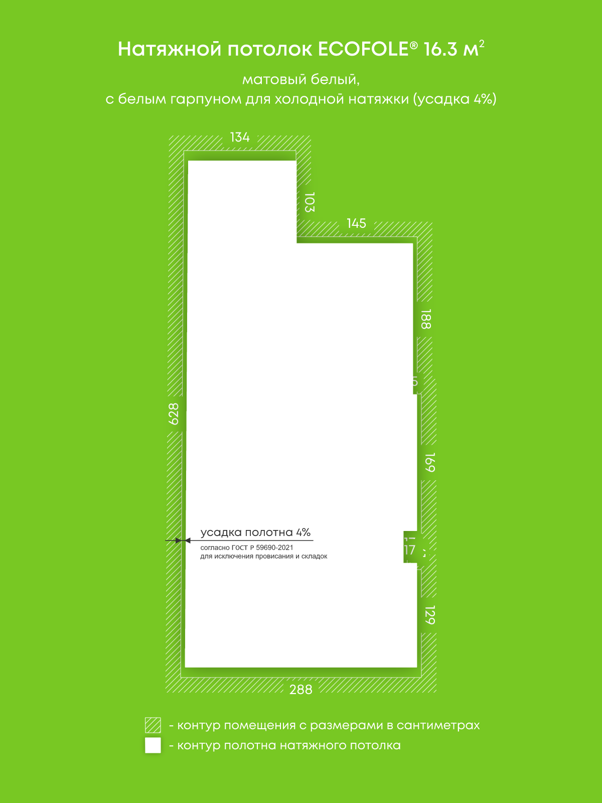 Натяжные потолки, изготовленные по индивидуальным размерам покупателя, для двух помещений площадью 16.3 м2, 3.4 м2