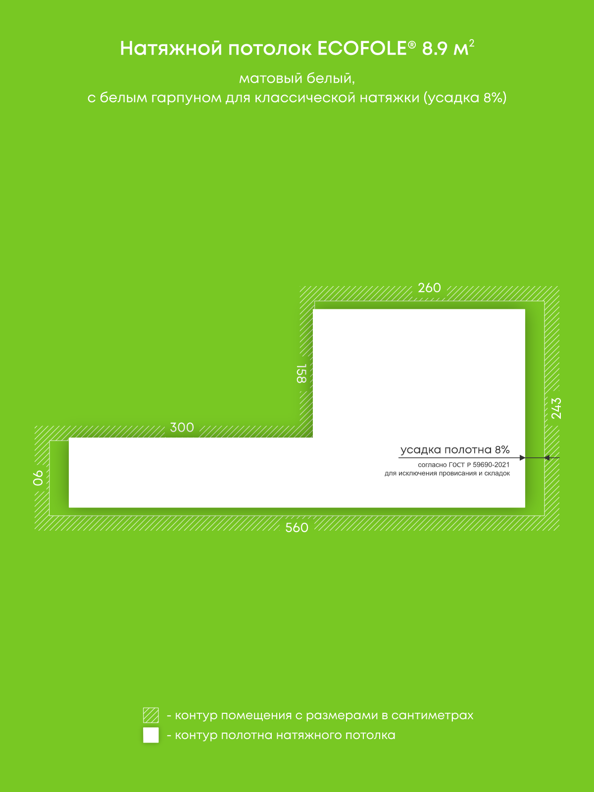 Натяжные потолки, изготовленные по индивидуальным размерам покупателя, для четырех помещений площадью 16.5 м2, 4.9 м2, 11.5 м2, 8.9 м2
