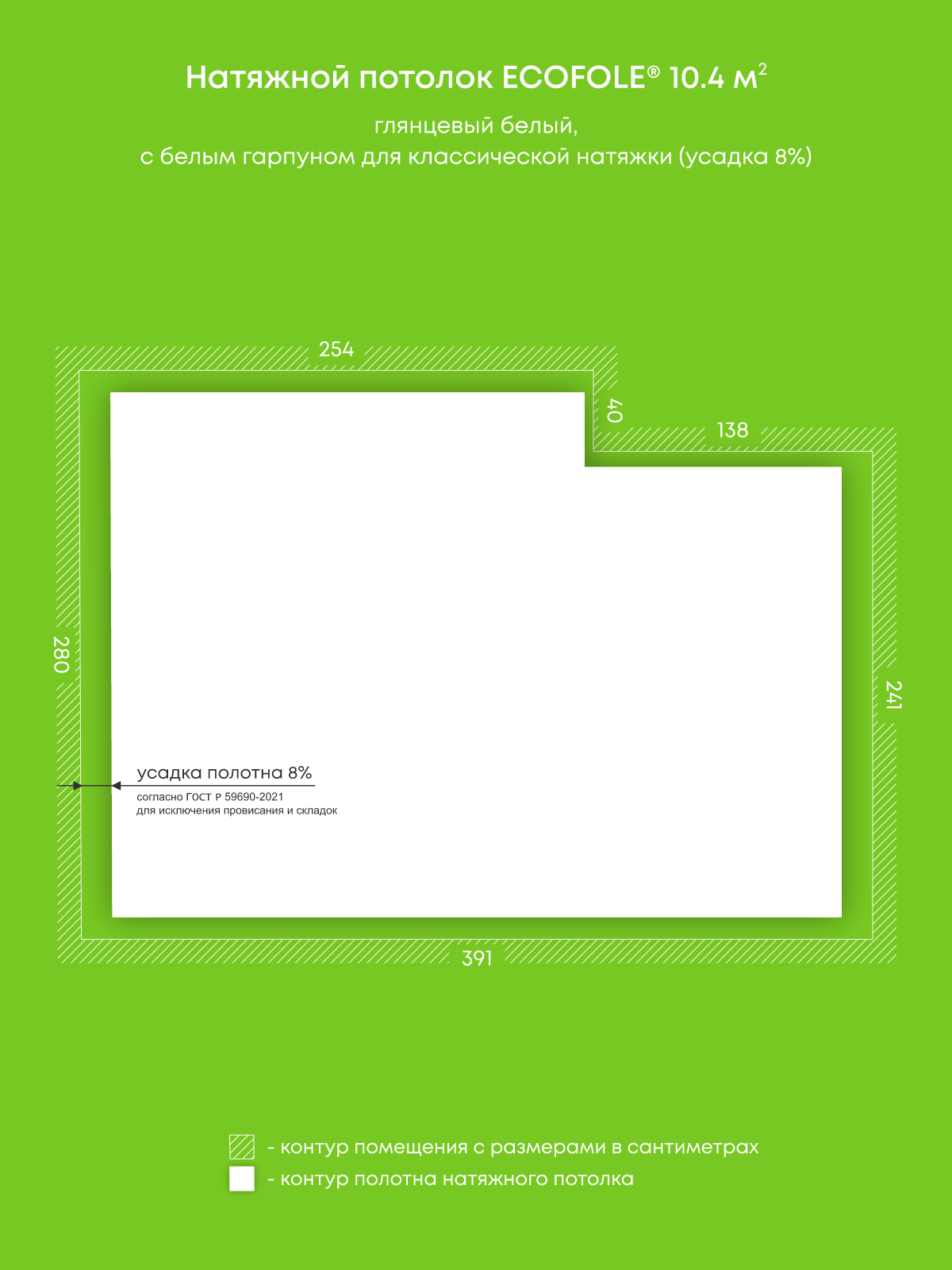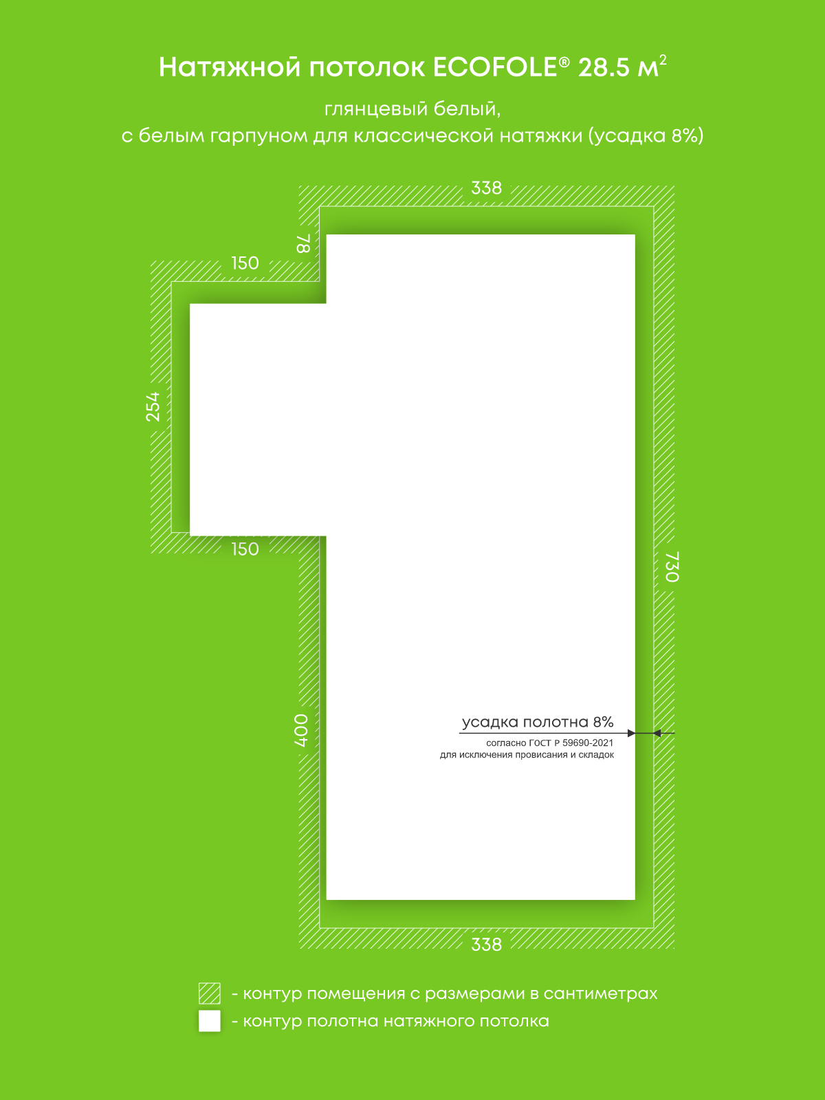 Натяжные потолки, изготовленные по индивидуальным размерам покупателя, для четырех помещений площадью 16.8 м2, 28.5 м2, 10.4 м2, 10.5 м2
