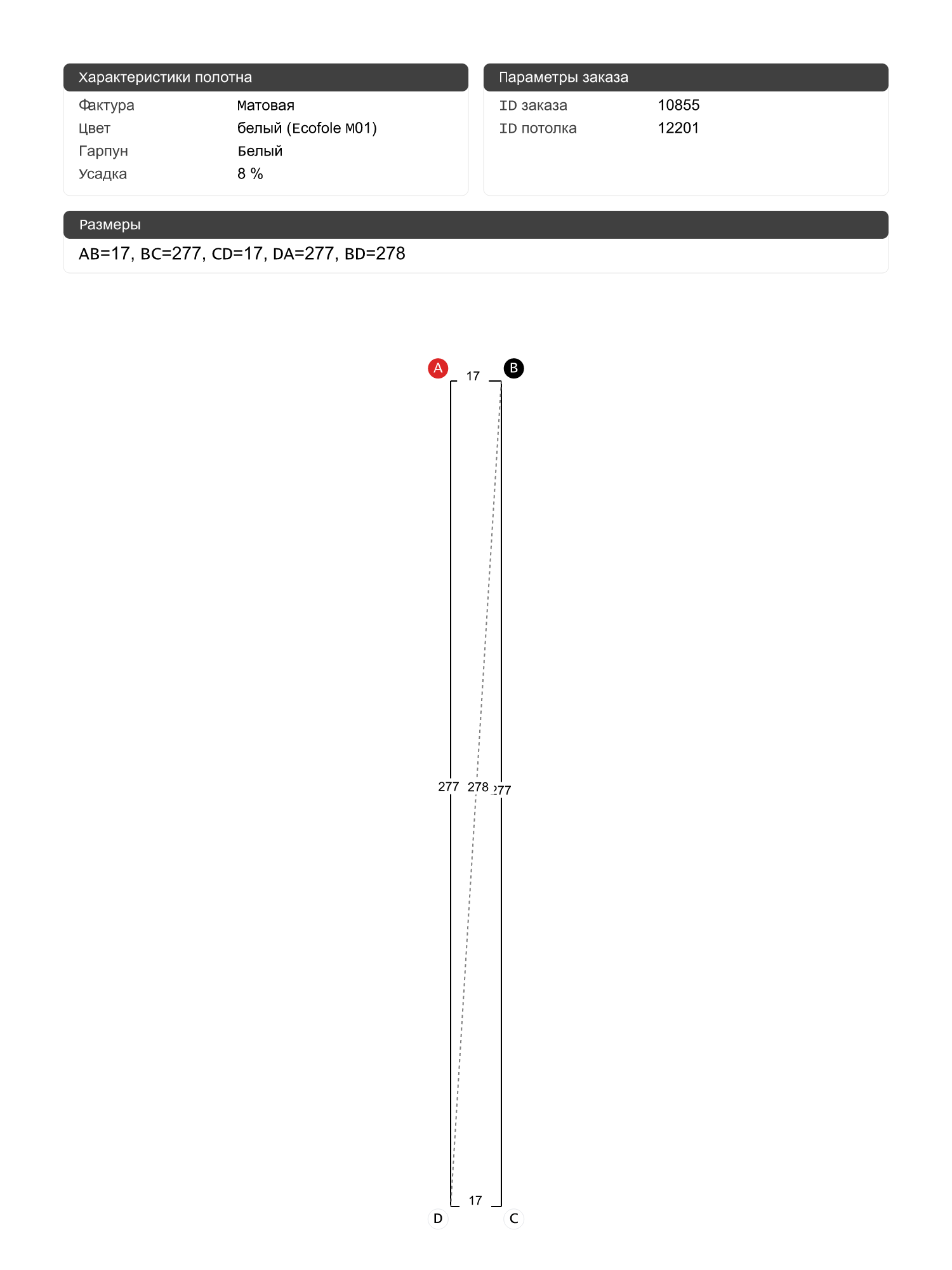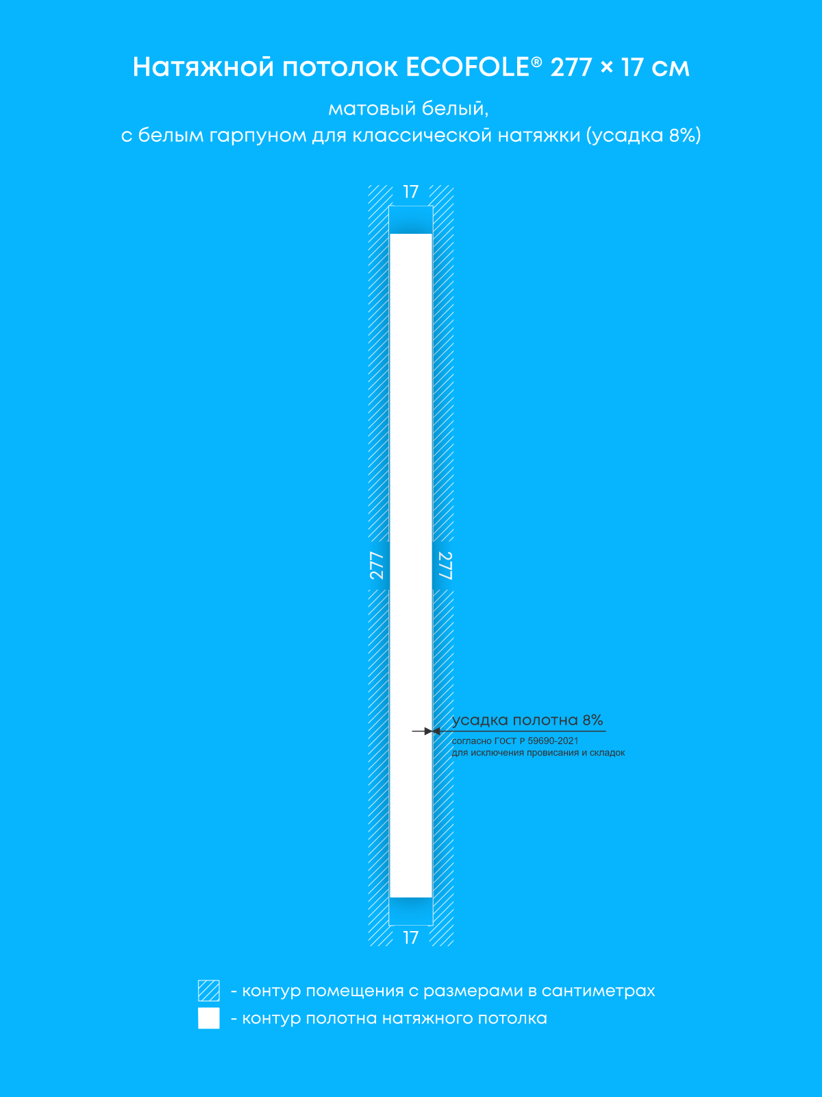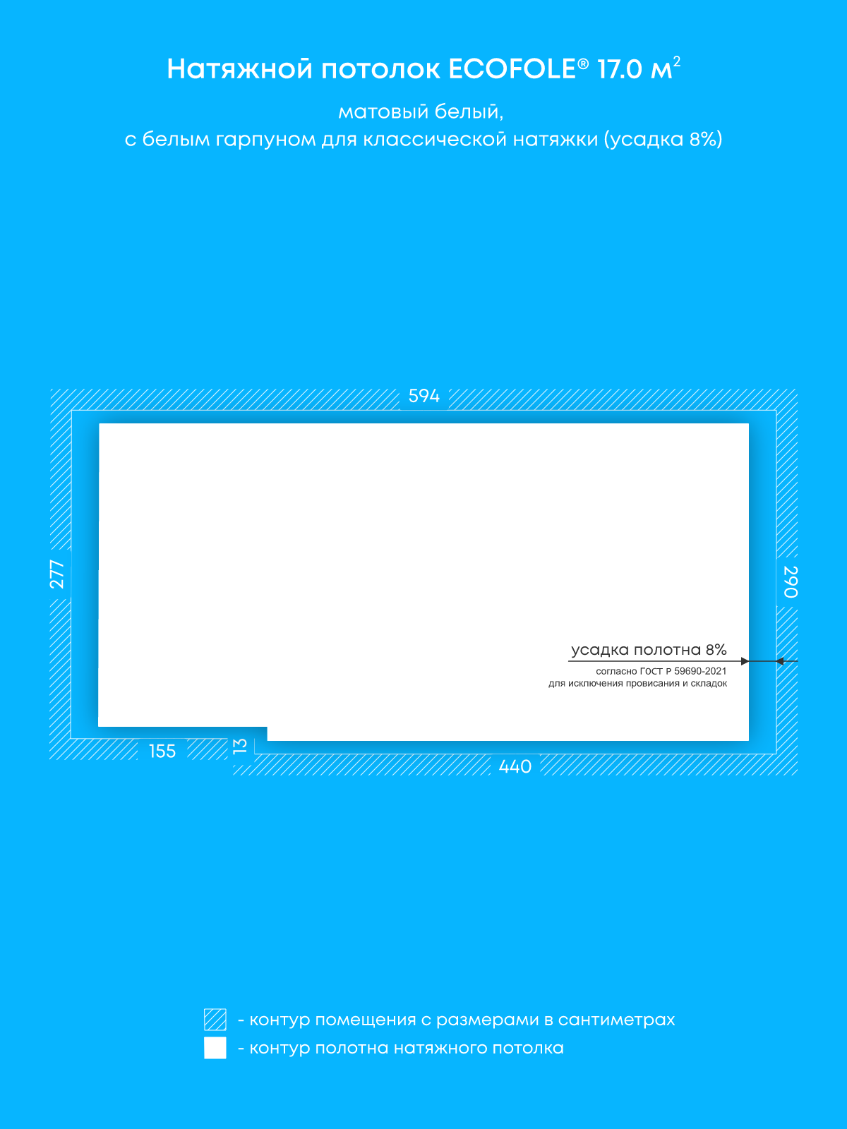 Натяжные потолки изготовленные по индивидуальным размерам покупателя, для двух помещений площадью: 17 м2, 0.5 м2