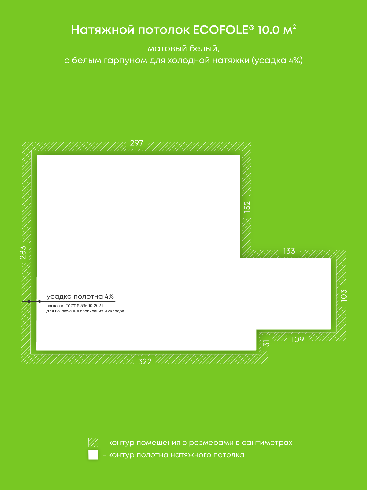 Натяжные потолки, изготовленные по индивидуальным размерам покупателя, для двух помещений площадью 1.7 м2, 10 м2