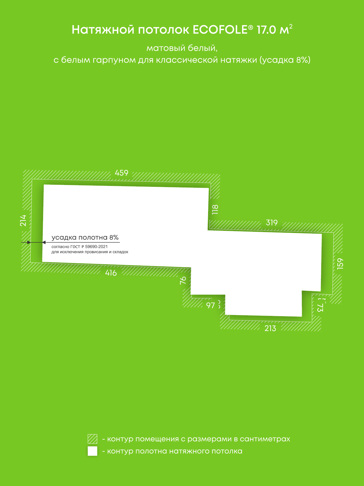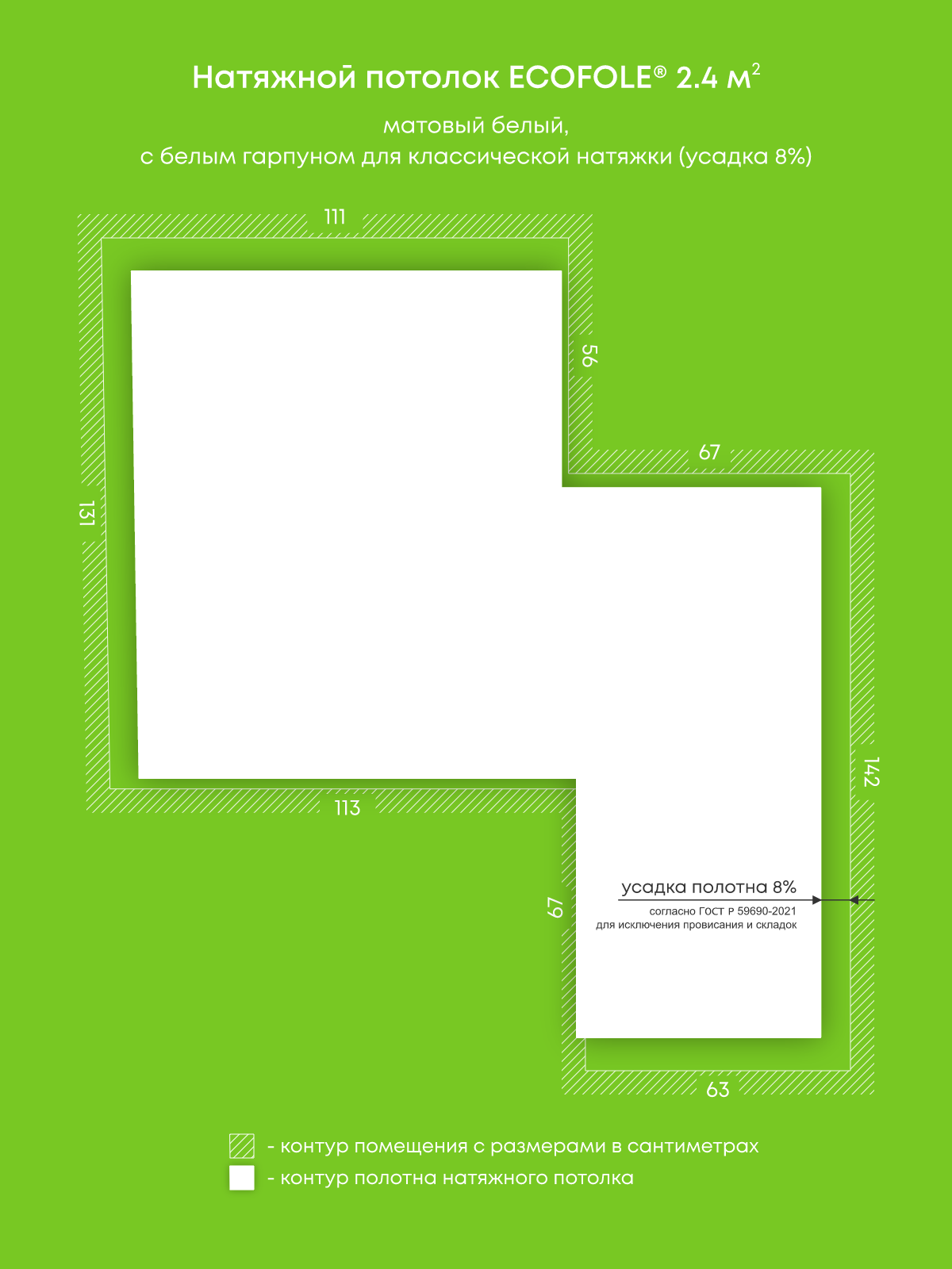 Натяжные потолки, изготовленные по индивидуальным размерам покупателя, для двух помещений площадью 17 м2, 2.4 м2