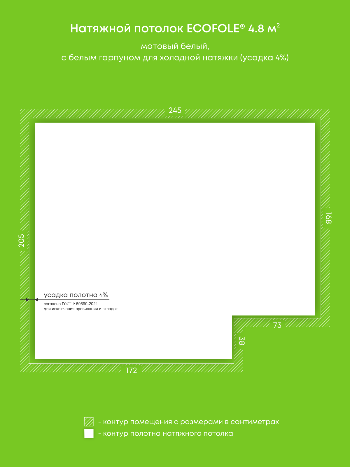 Натяжные потолки, изготовленные по индивидуальным размерам покупателя, для четырех помещений площадью 17.3 м2, 16.9 м2, 4.8 м2, 27.8 м2