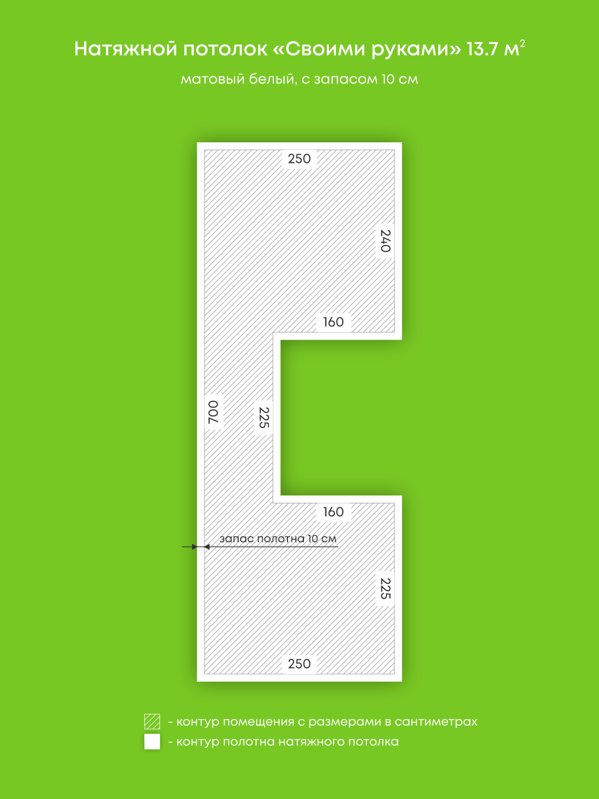 Натяжные потолки, изготовленные по индивидуальным размерам покупателя, для пяти помещений площадью 17.4 м2, 17.4 м2, 2 м2, 0.9 м2, 13.7 м2
