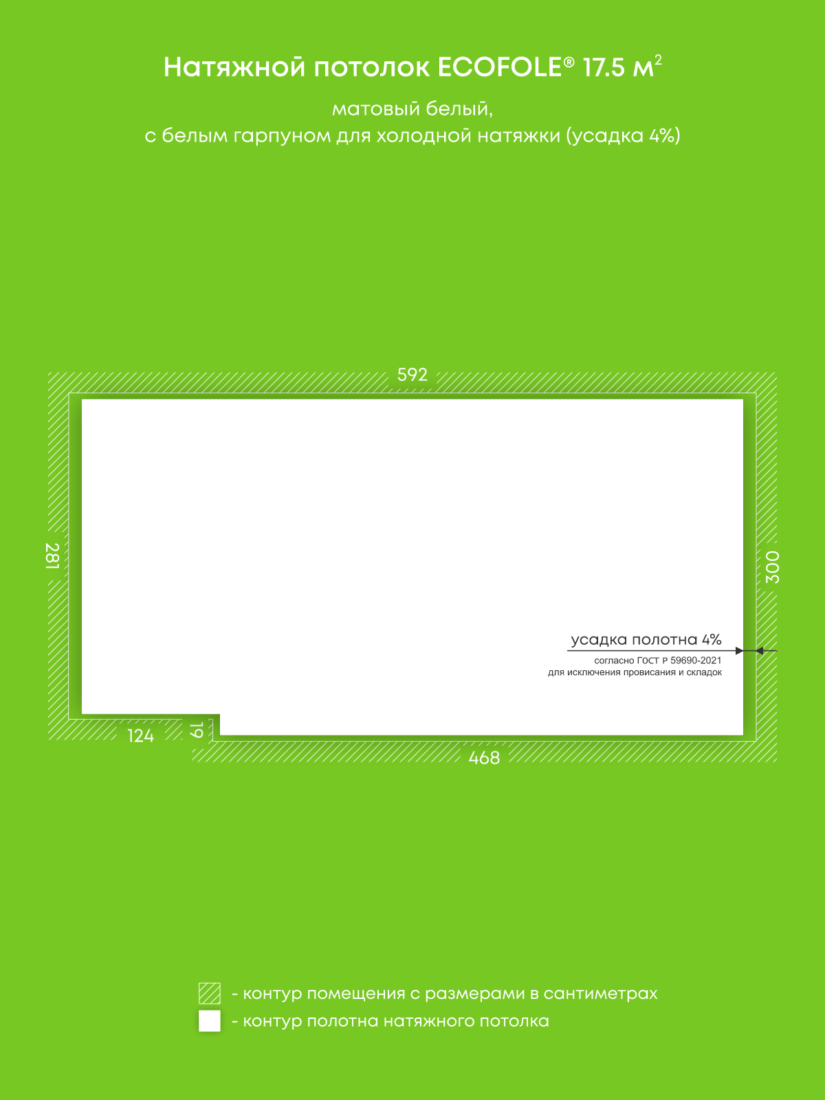 Натяжные потолки, изготовленные по индивидуальным размерам покупателя, для трех помещений площадью 17.5 м2, 0.3 м2, 13.5 м2