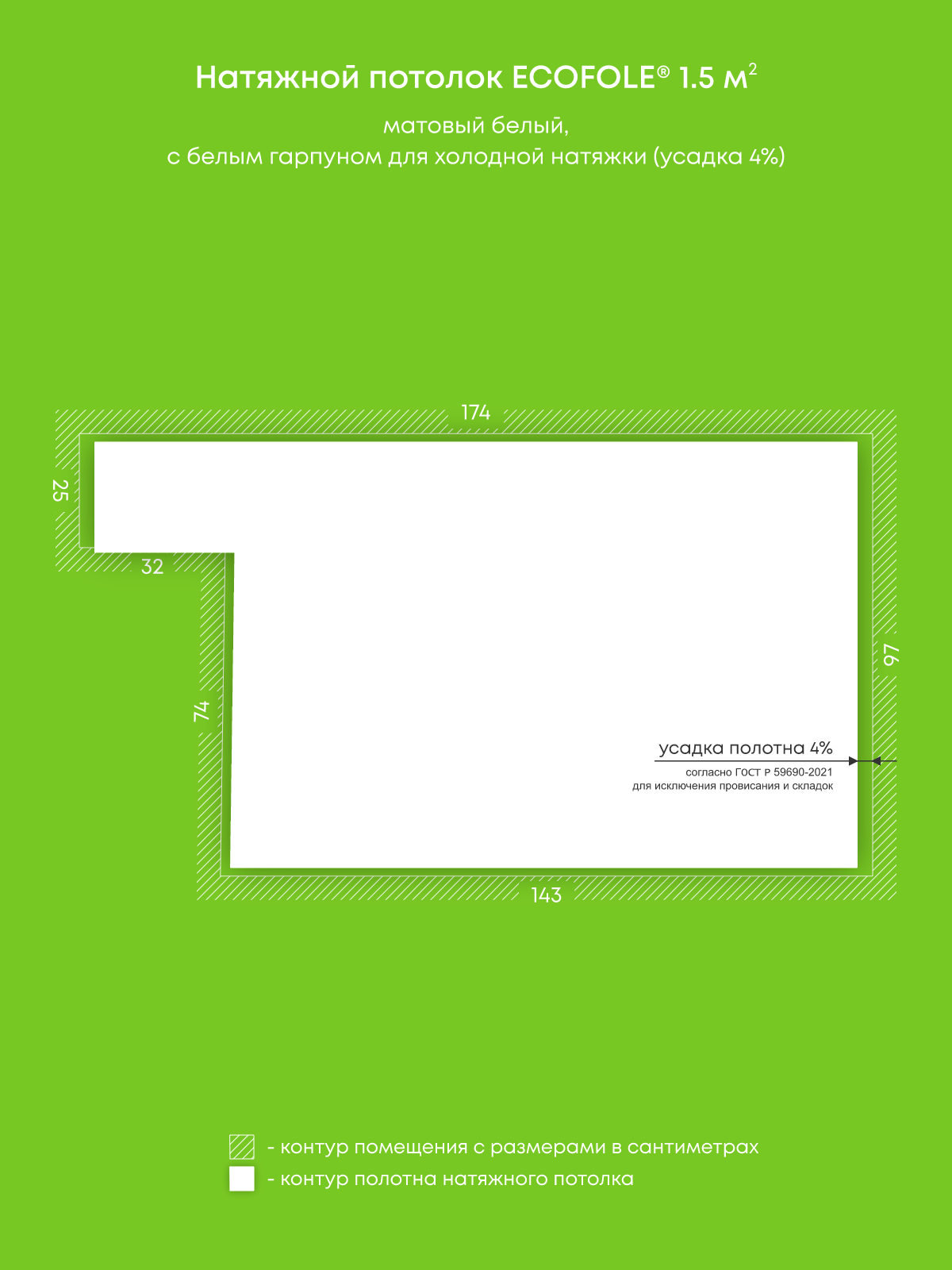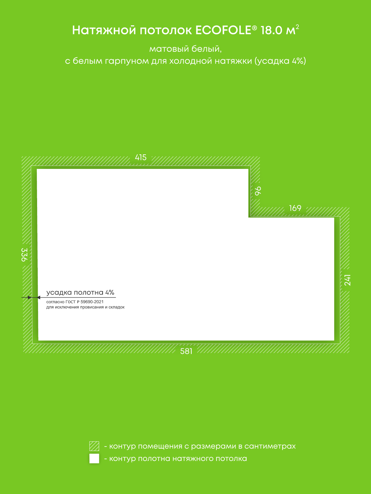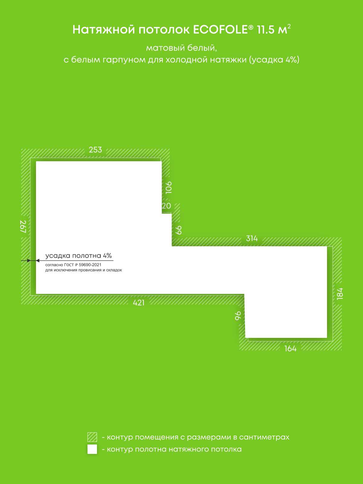 Натяжные потолки, изготовленные по индивидуальным размерам покупателя, для четырех помещений площадью 18 м2, 11.5 м2, 3.1 м2, 1.5 м2