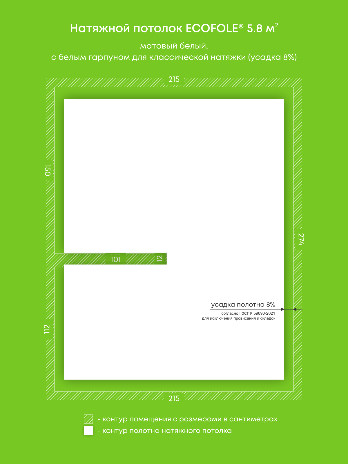 Натяжные потолки, изготовленные по индивидуальным размерам покупателя, для пяти помещений площадью 18 м2, 17 м2, 5.8 м2, 5.4 м2, 13.6 м2