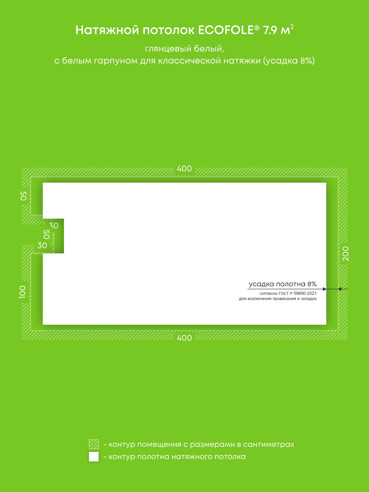 Натяжные потолки, изготовленные по индивидуальным размерам покупателя, для двух помещений площадью 20 м2, 7.9 м2