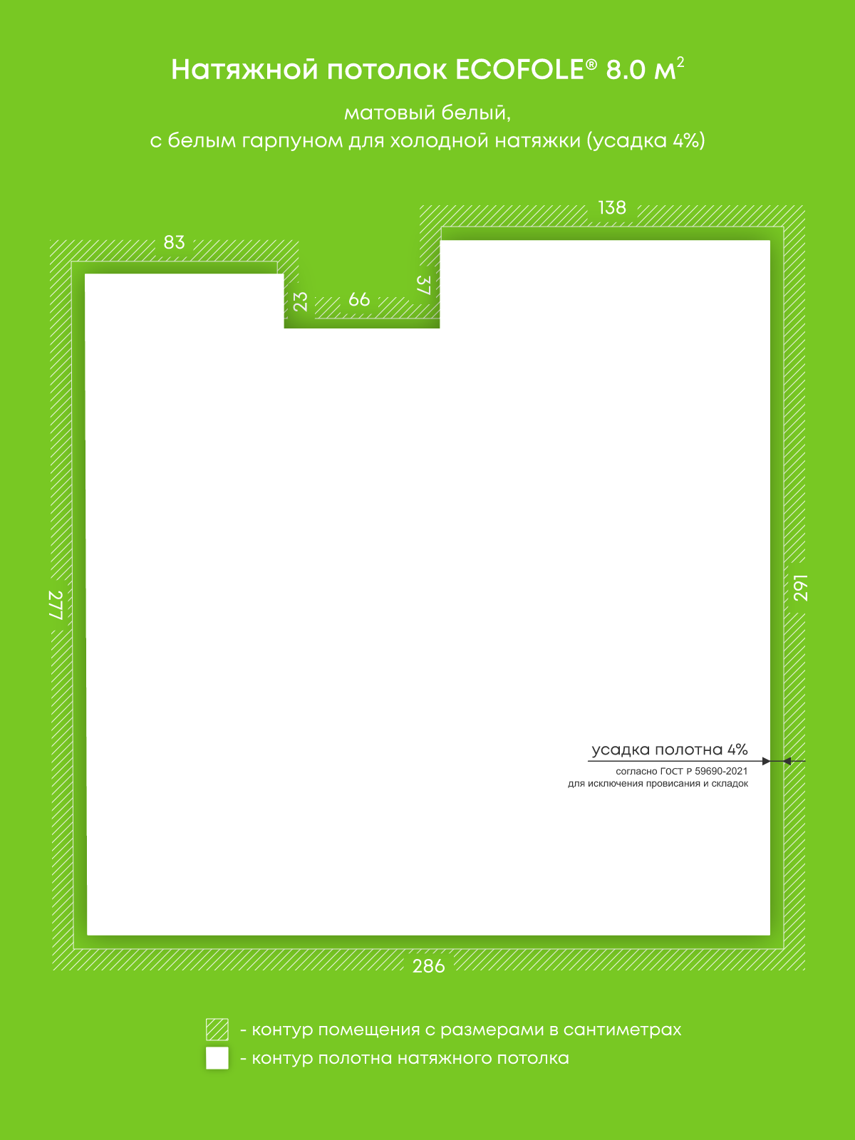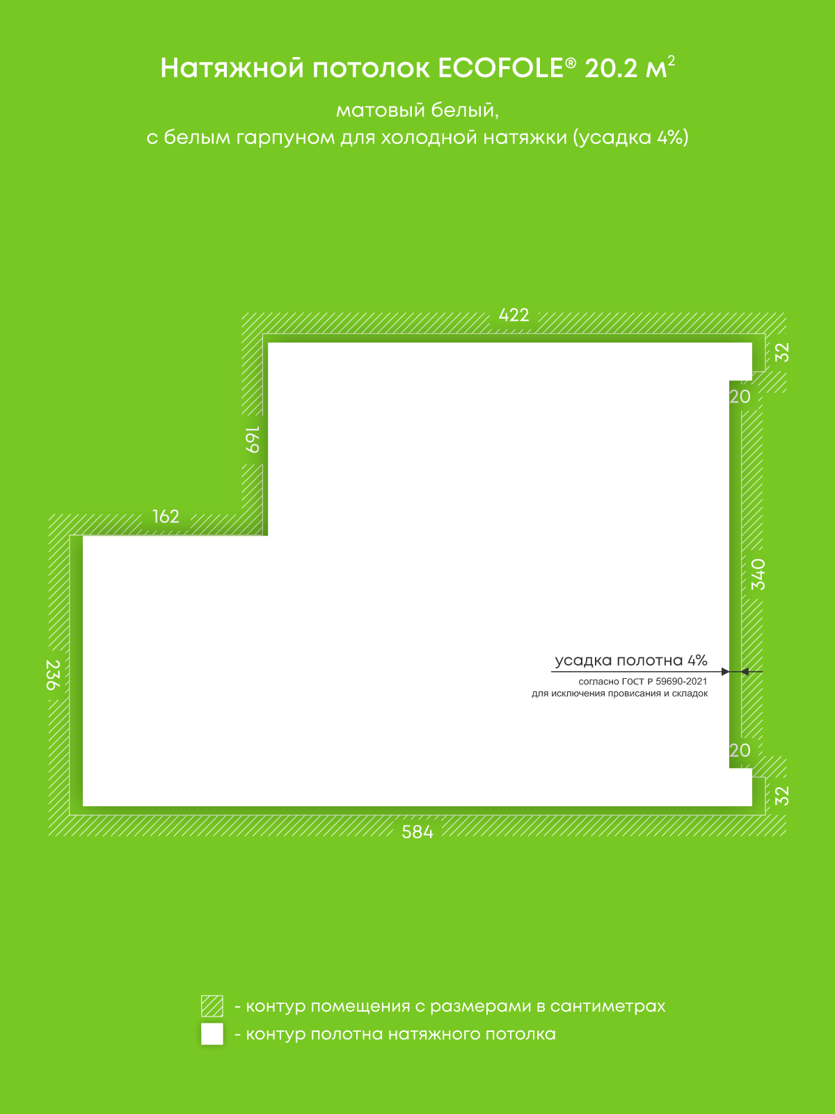 Натяжные потолки, изготовленные по индивидуальным размерам покупателя, для трех помещений площадью 20.2 м2, 8 м2, 5.3 м2