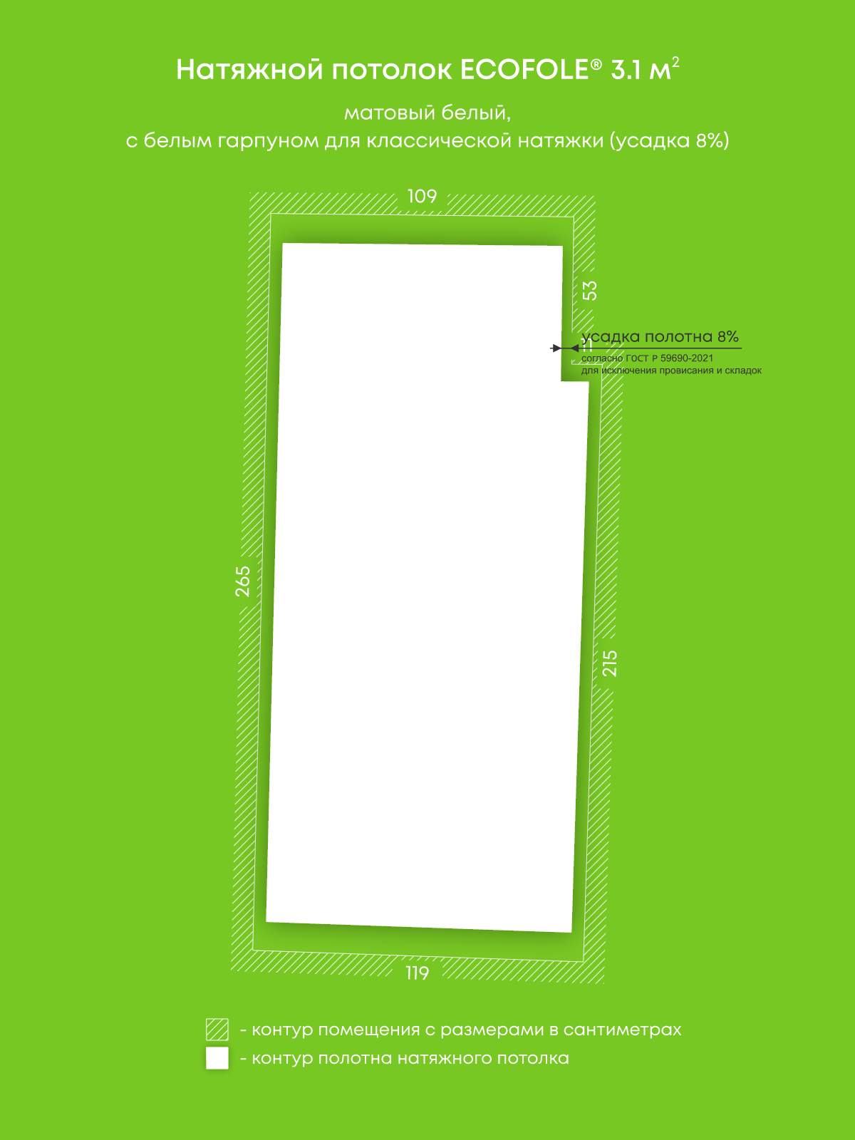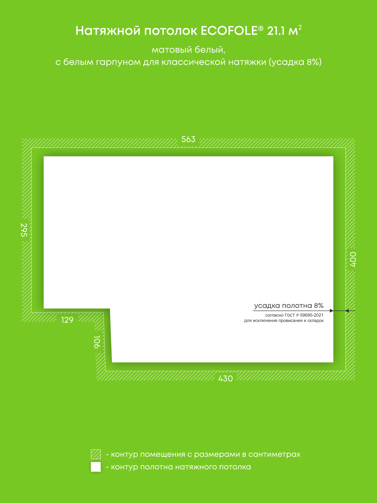 Натяжные потолки, изготовленные по индивидуальным размерам покупателя, для четырех помещений площадью 21.1 м2, 3.8 м2, 2.9 м2, 3.1 м2