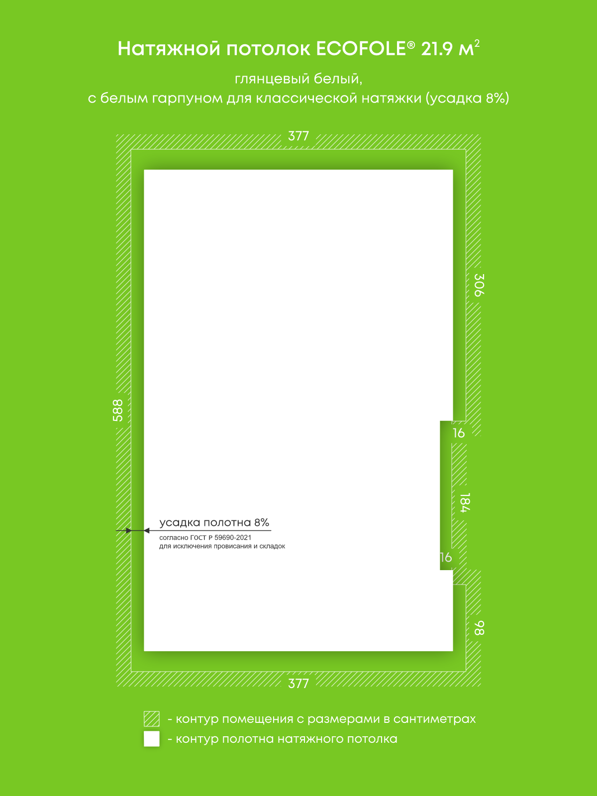 Натяжные потолки, изготовленные по индивидуальным размерам покупателя, для двух помещений площадью 21.9 м2, 10 м2